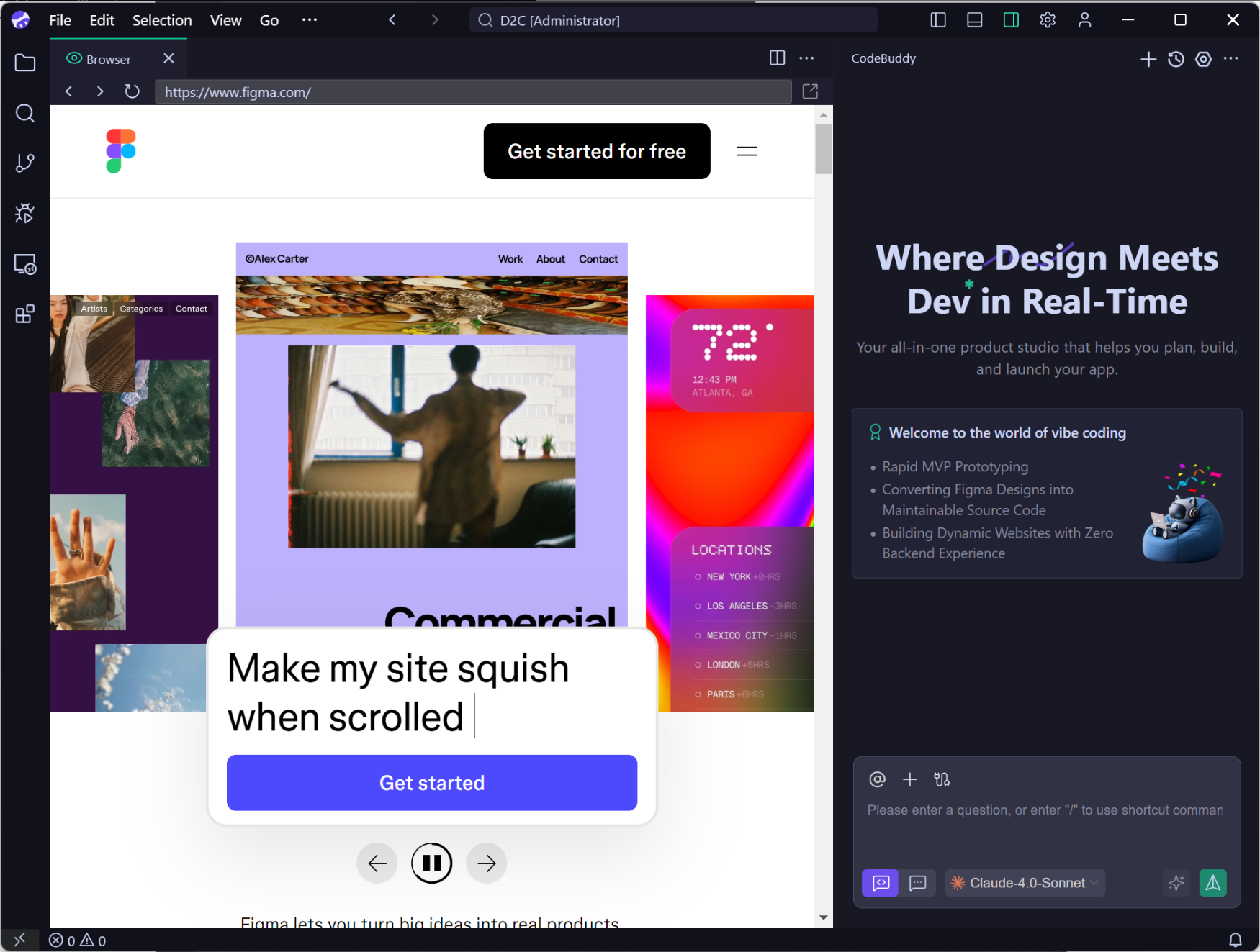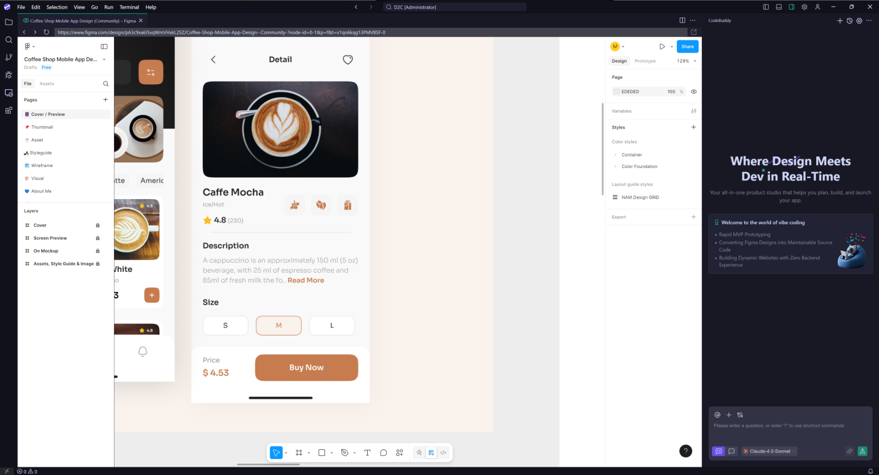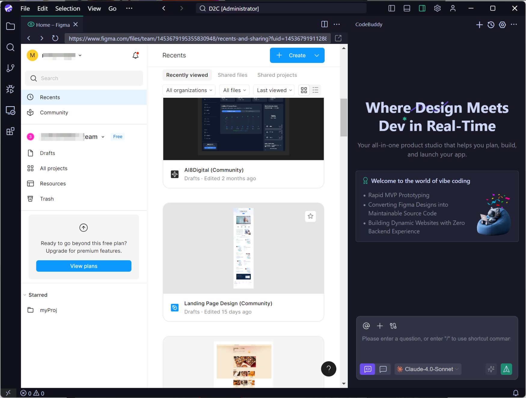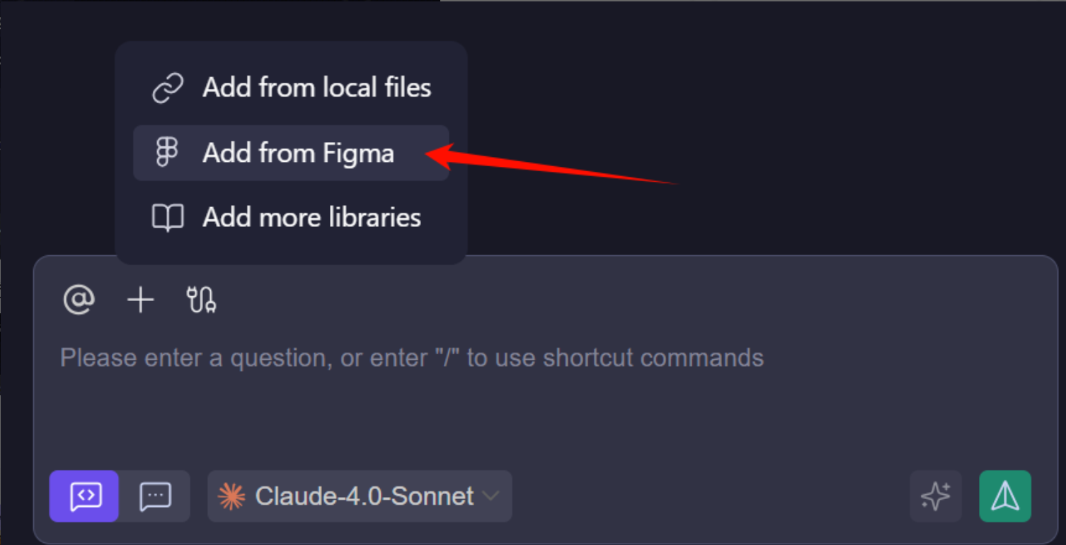 从设计到代码生成是 CodeBuddy IDE 的核心功能之一,支持通过 Add fromFigma 功能按钮从内置的 Figma 中选择设计稿导入到 IDE 中,可准确将 Figma 设计稿转换为生产代码。下面将介绍如何从Figma 中导入设计稿组件到 IDE 中。