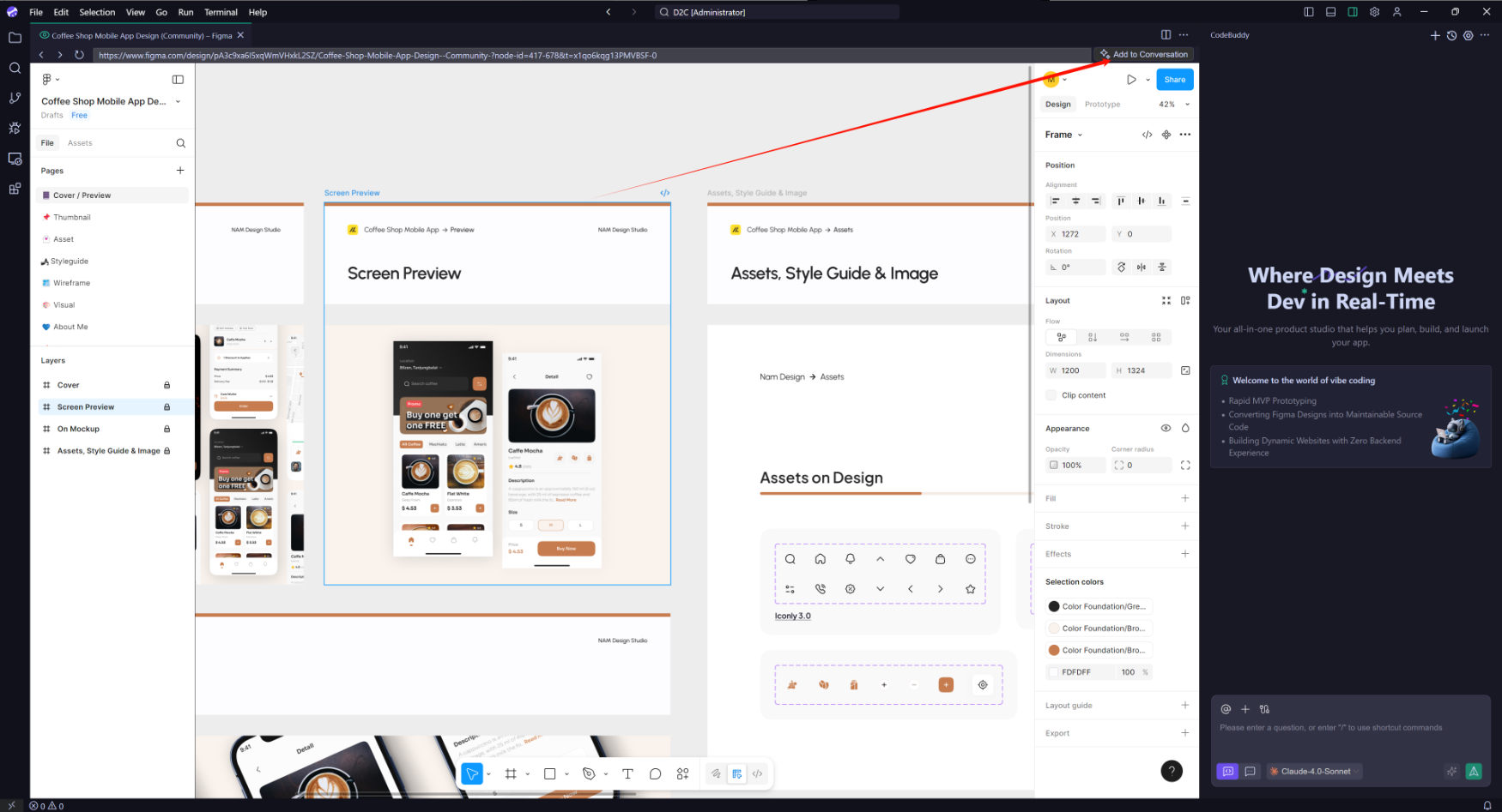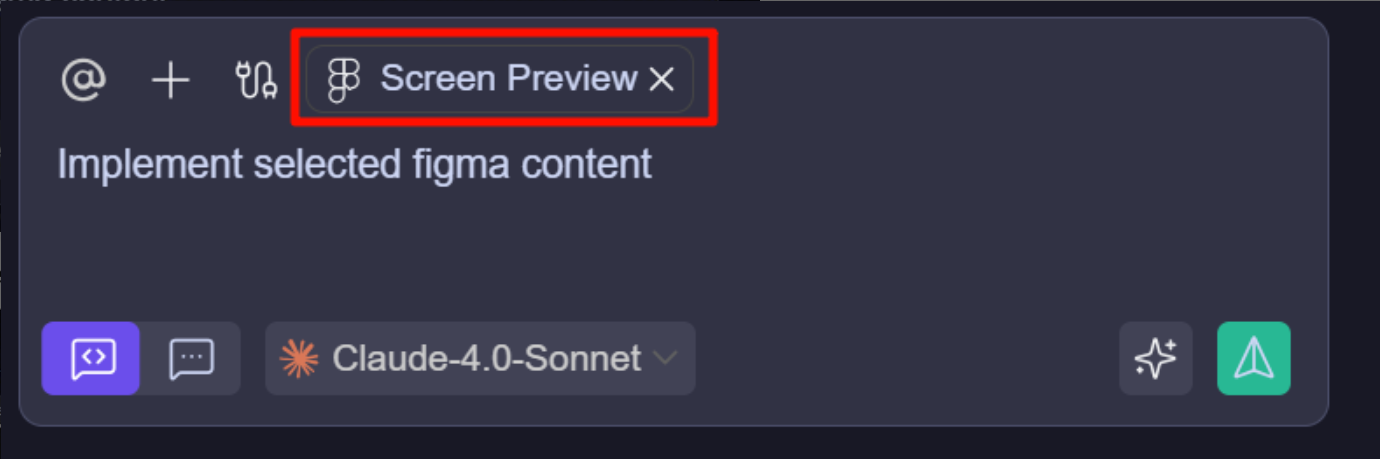 在 Layers 中,选择需要的组件或区域,然后点击右上方的 Add toConversation 按钮,将设计稿导入 IDE 站内。