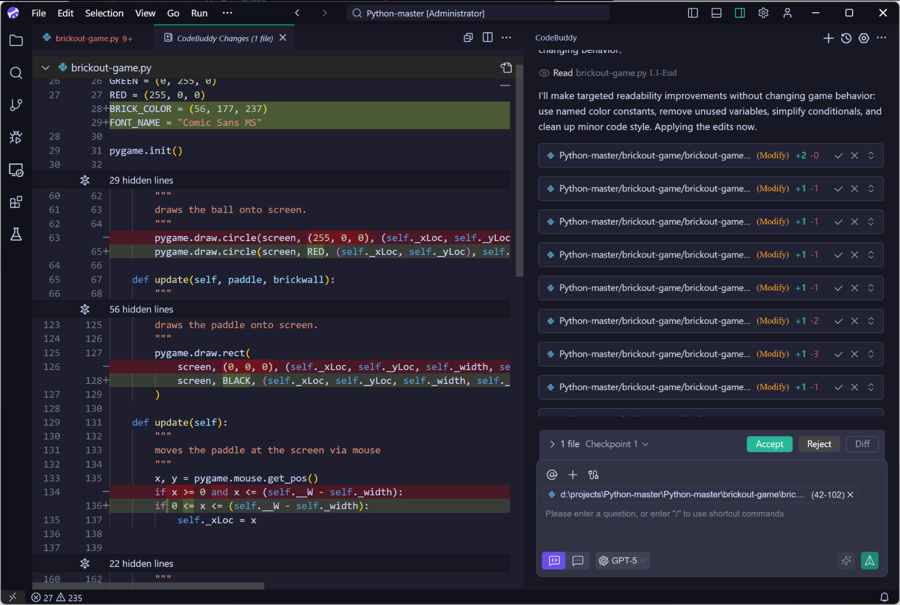 在对话框中输入任务描述后,Craft Agent 会直接进行代码分析并改写文件,在改写文件的过程中以diff 的形式进行展示。