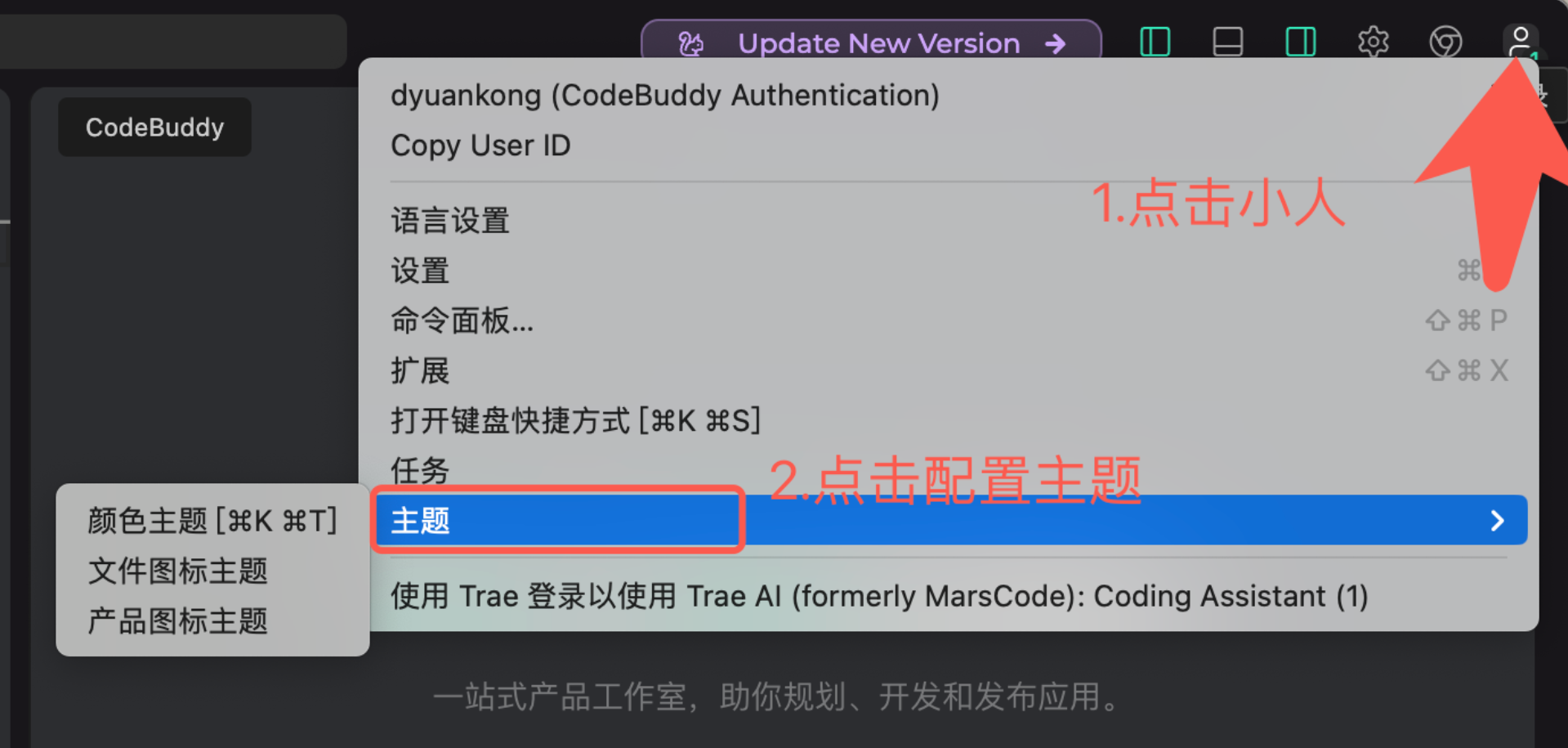 点击主题,选择配置主题,主题可选有颜色主题、文件图标主题、产品图标主题。