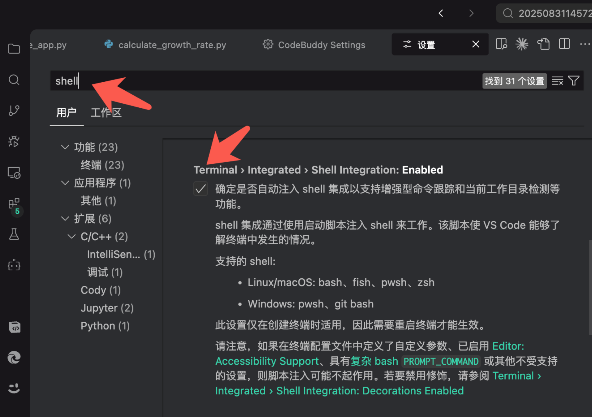 在设置中搜索 shell,开启 Terminal Intergrated Shell Intergration 为 Enable。
