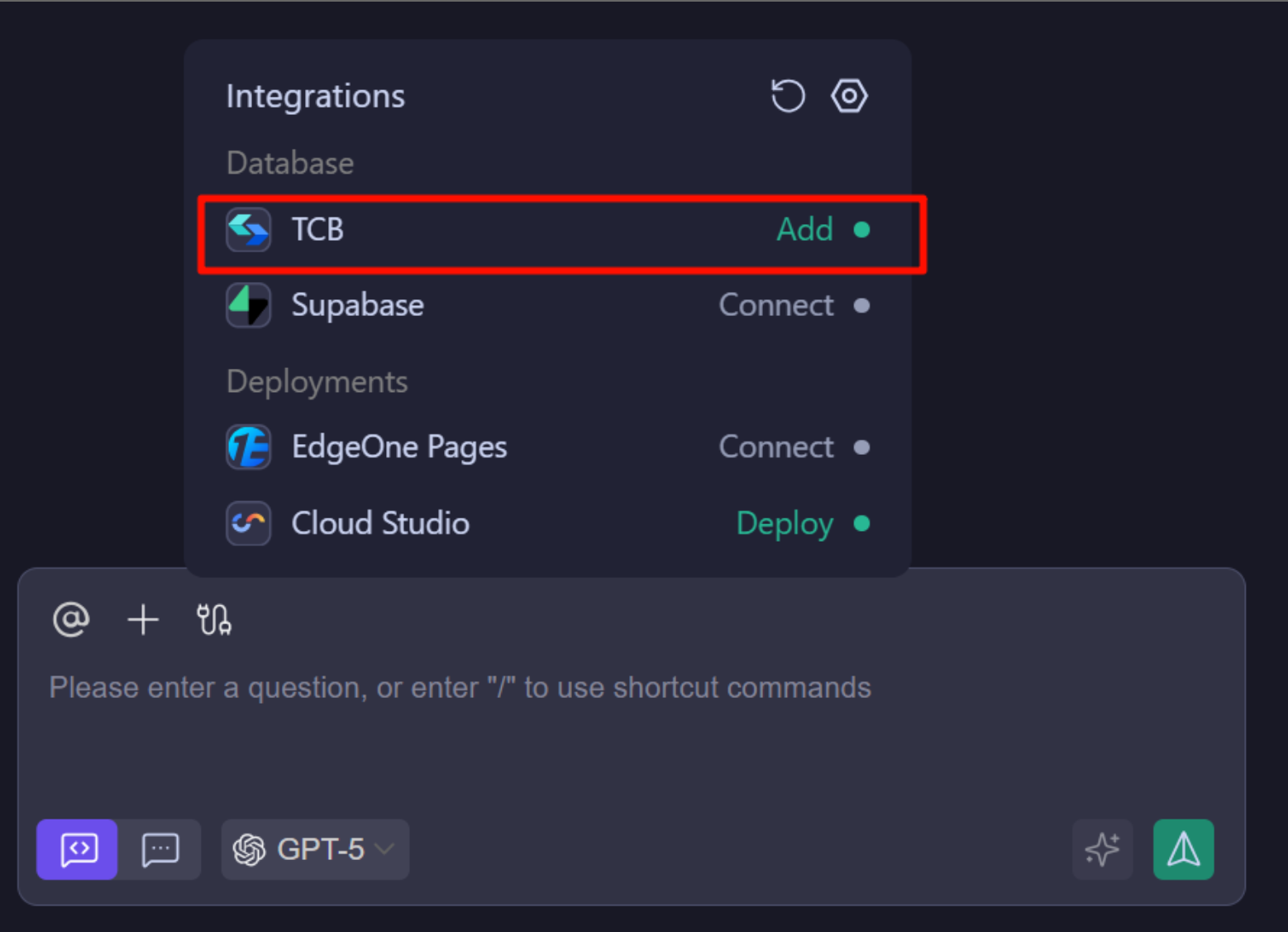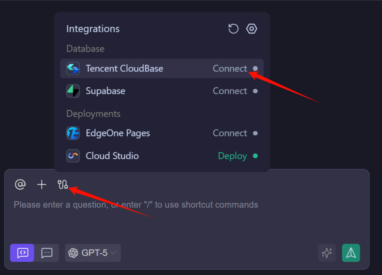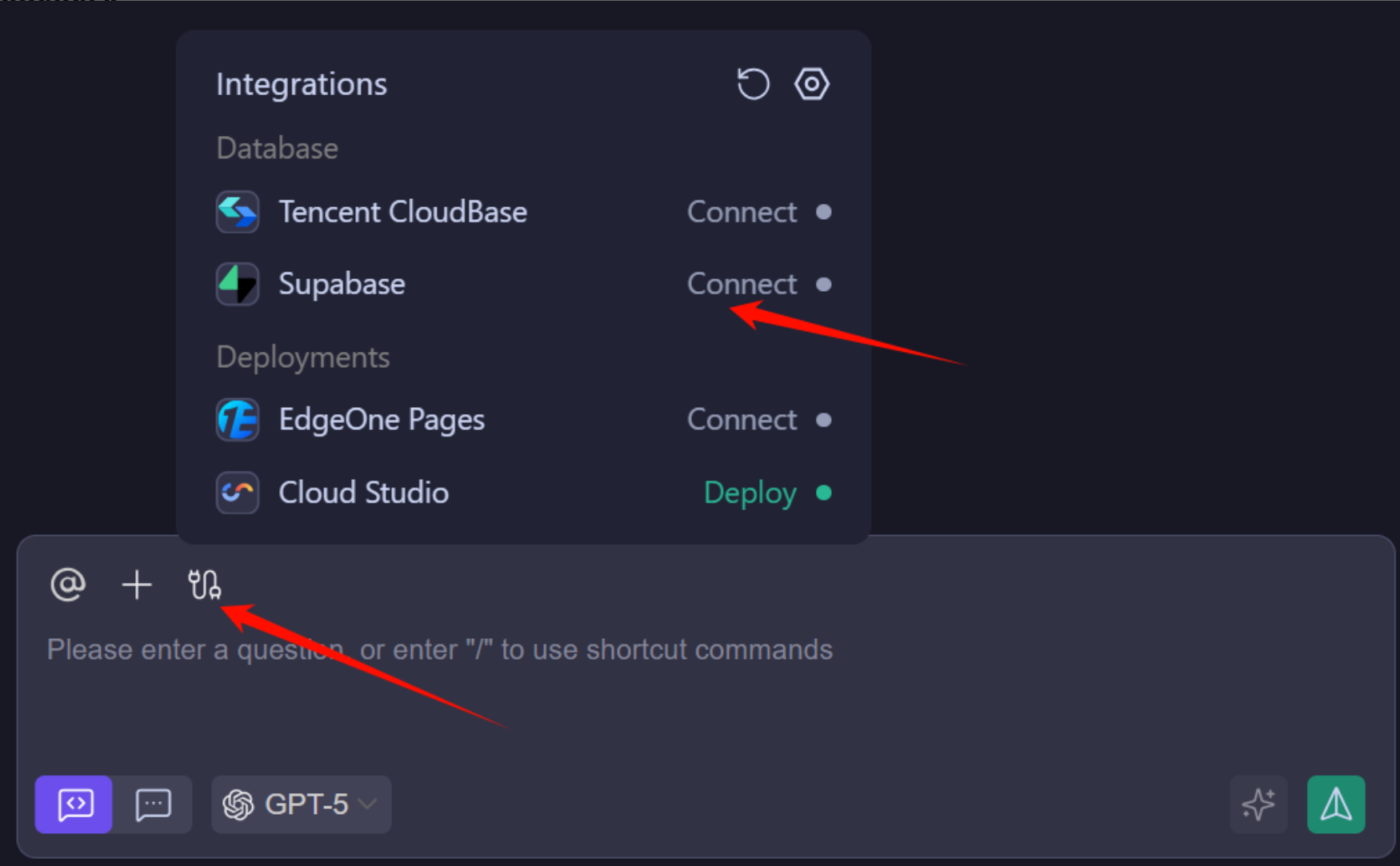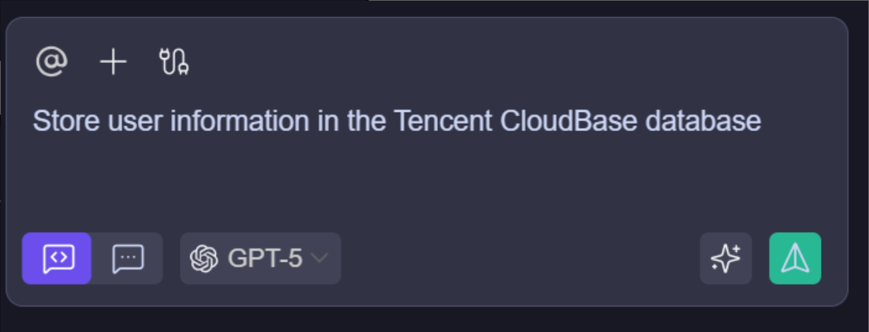 CodeBuddy 集成了 Supabase、Tencent CloudBase 后端服务,无需进行繁琐的配置,即可获得一个可运行的后端环境。