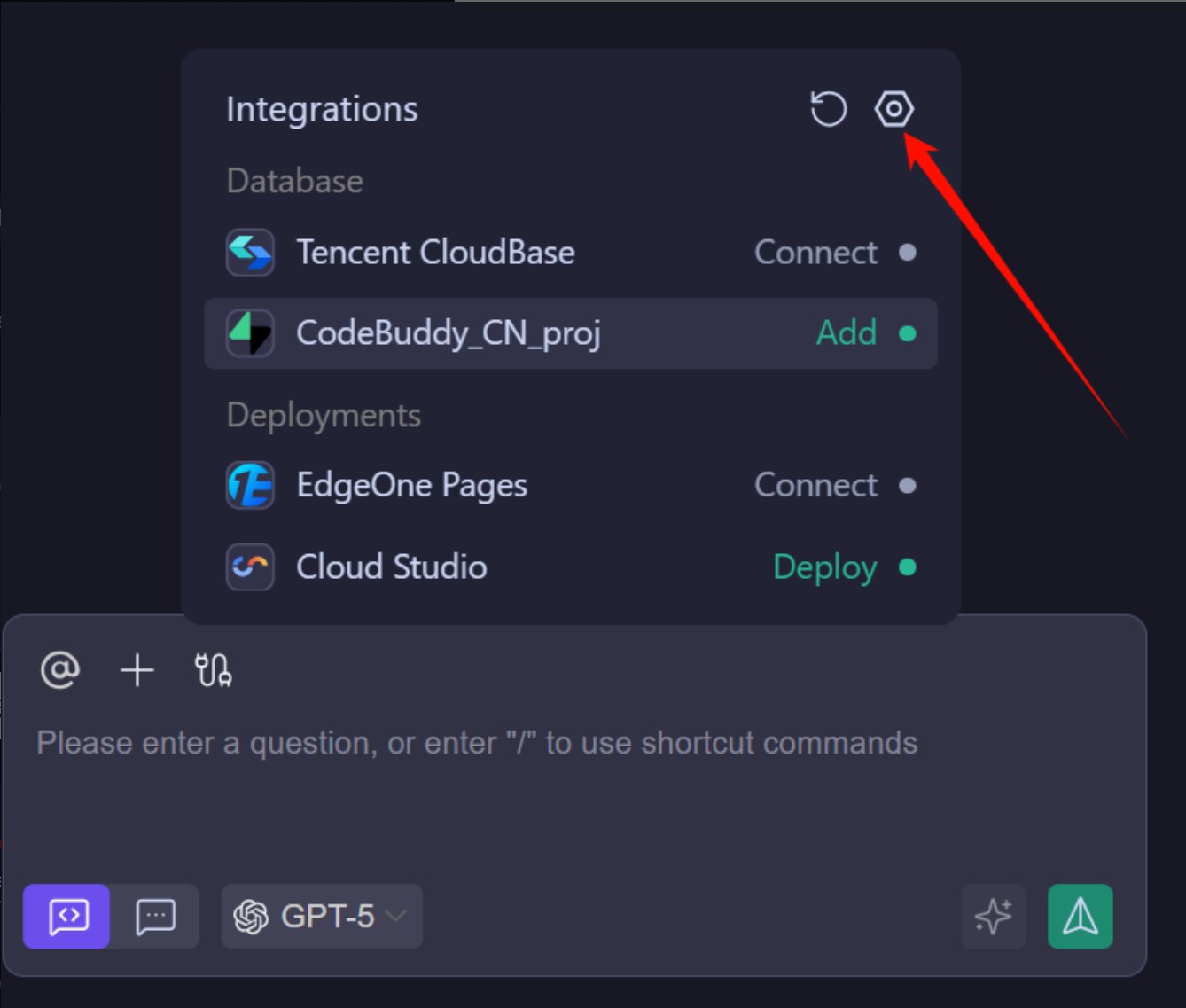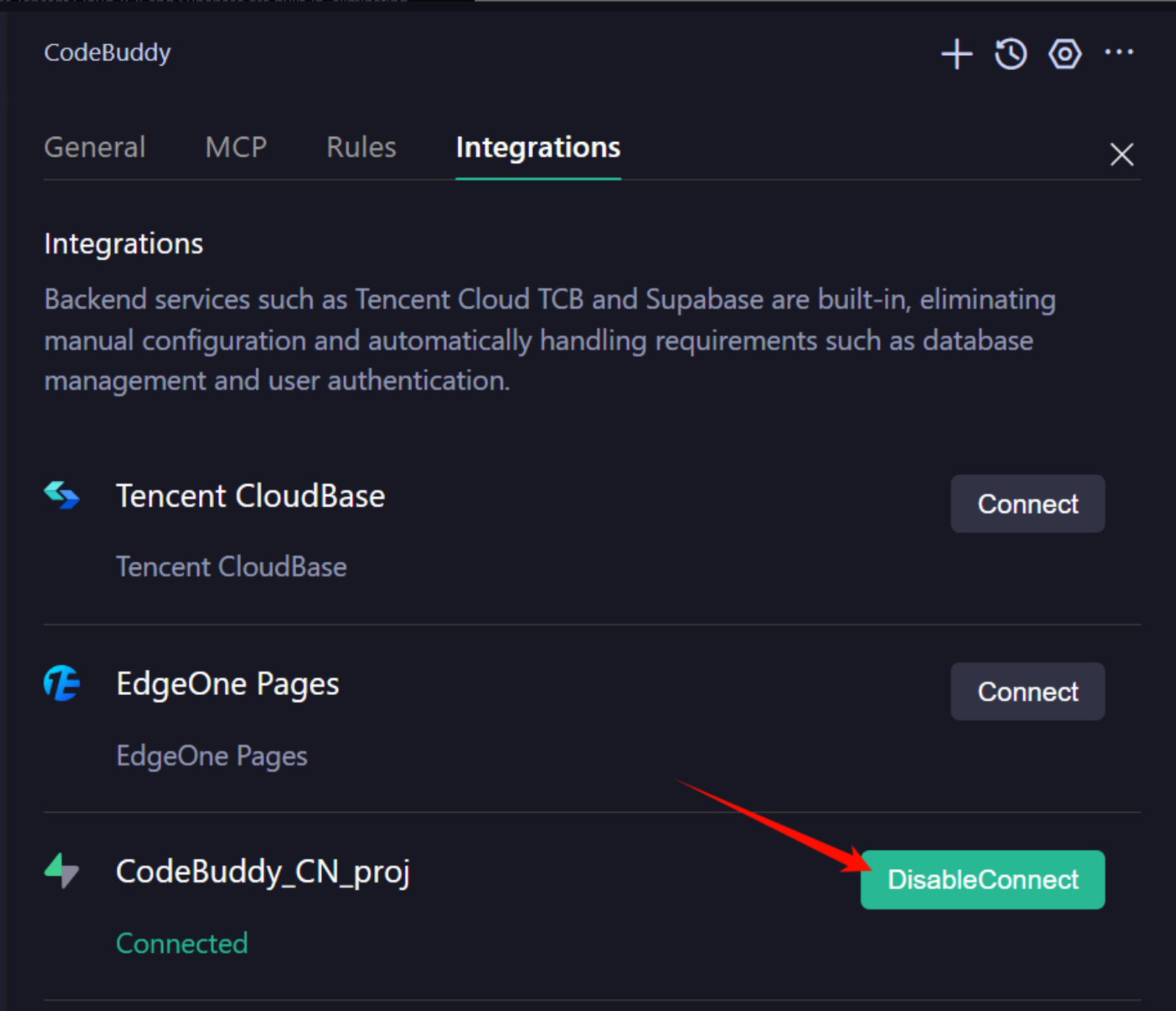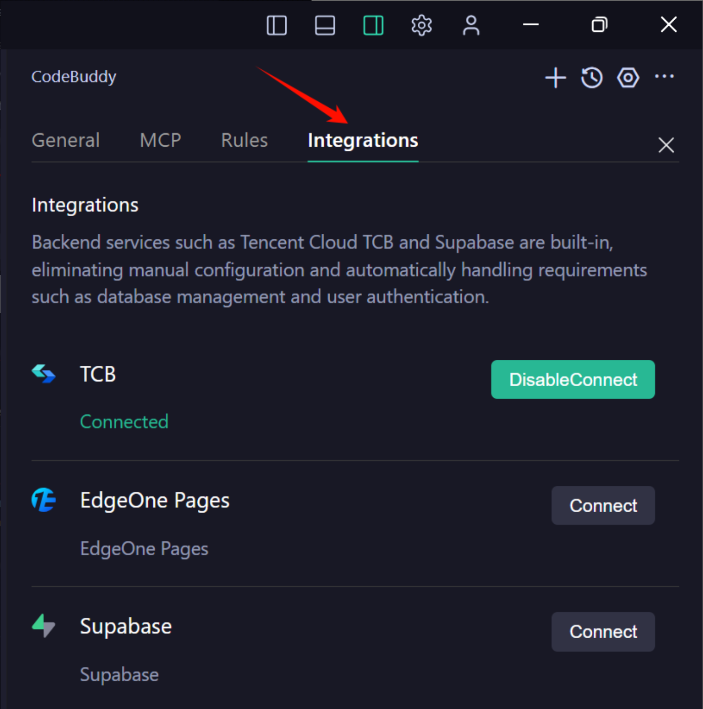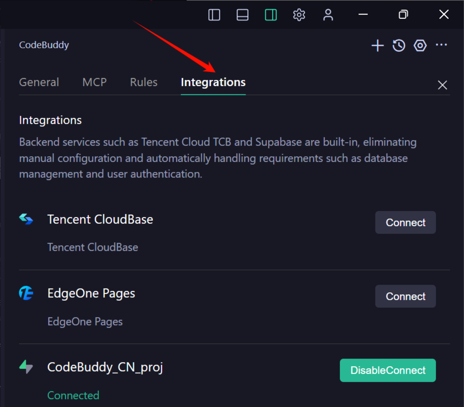 在侧栏对话框中,单击 Integration 右侧的设置,进入 CodeBuddy的配置页。