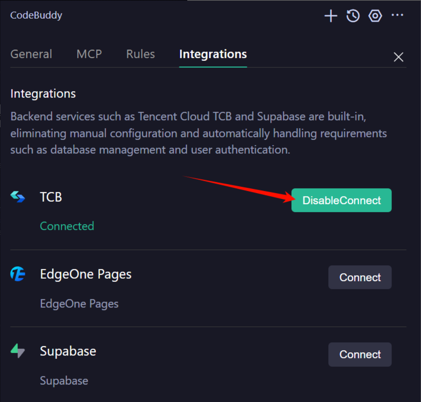 点击所连接的 Supabase 项目右侧的 DisableConnect 即可。