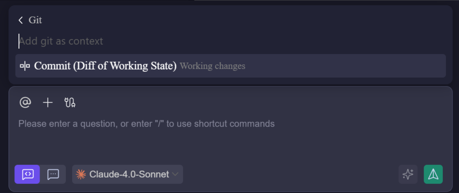 @Working changes:引用当前工作区中未提交的所有变更,包括已暂存变更、未暂存变更、未跟踪文件。