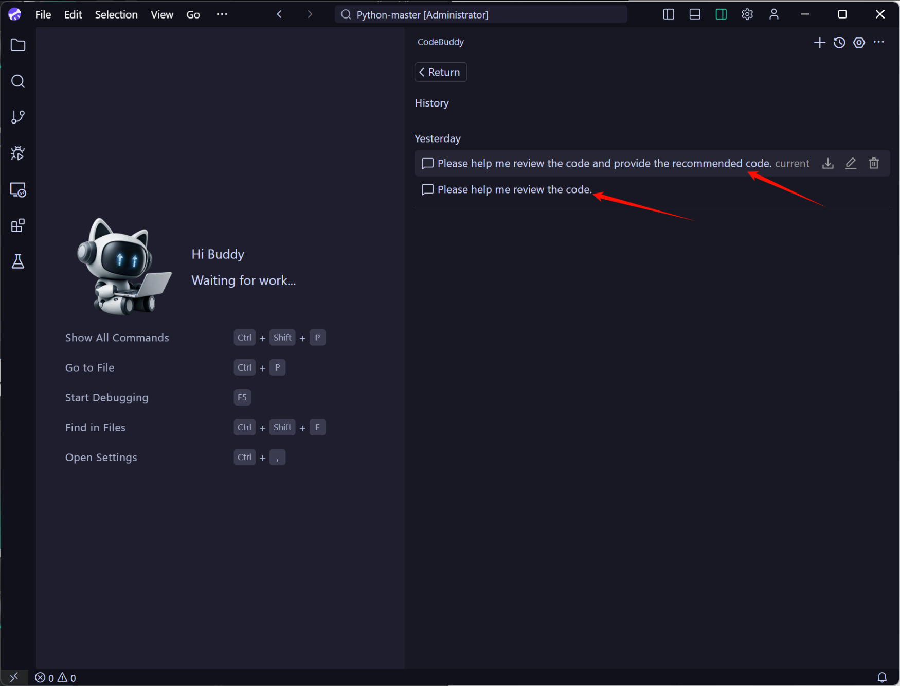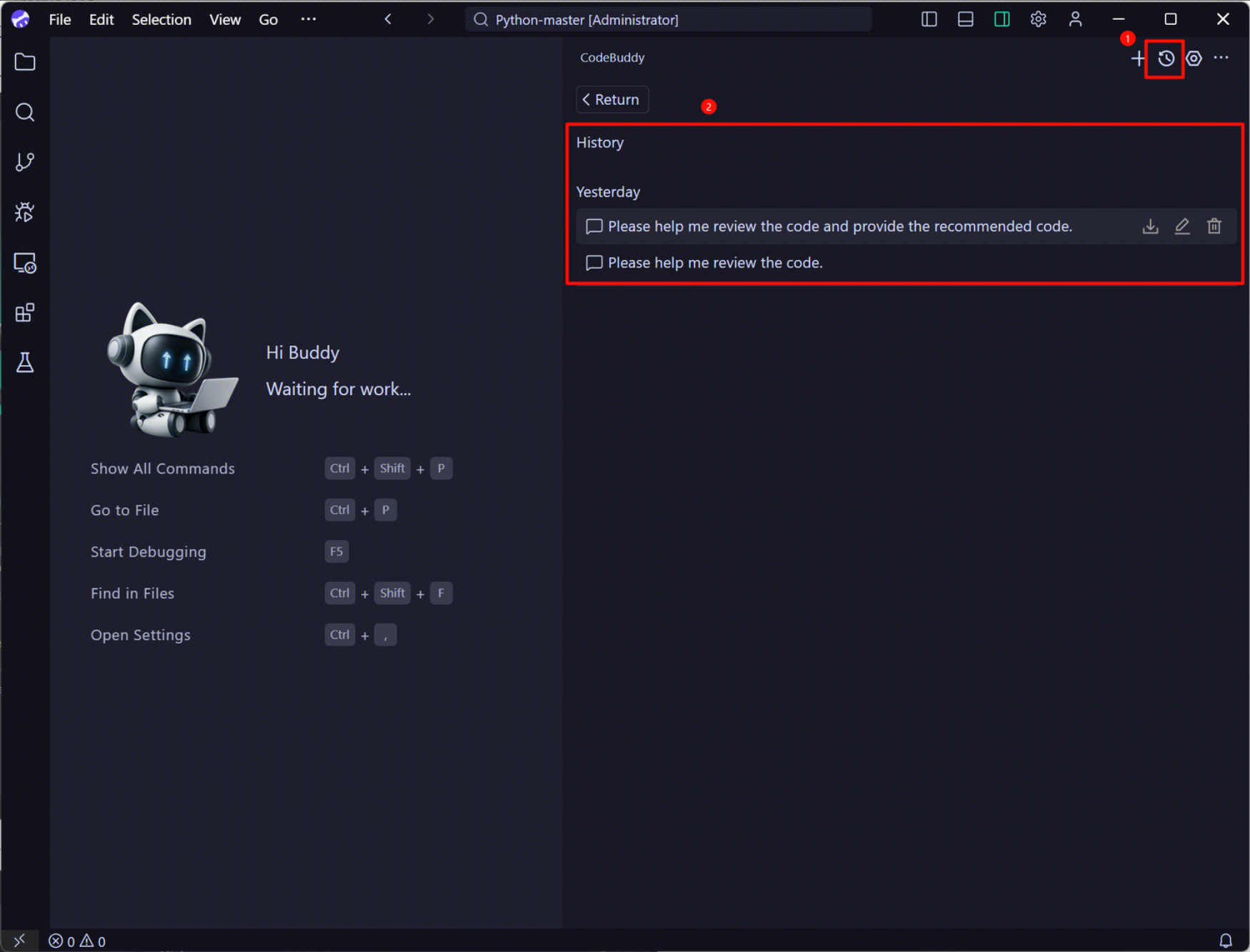 在 CodeBuddy IDE 的侧栏对话面板右上方,单击 History 按钮,即可查看历史对话列表。