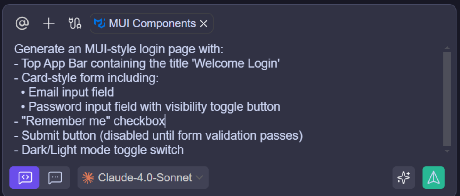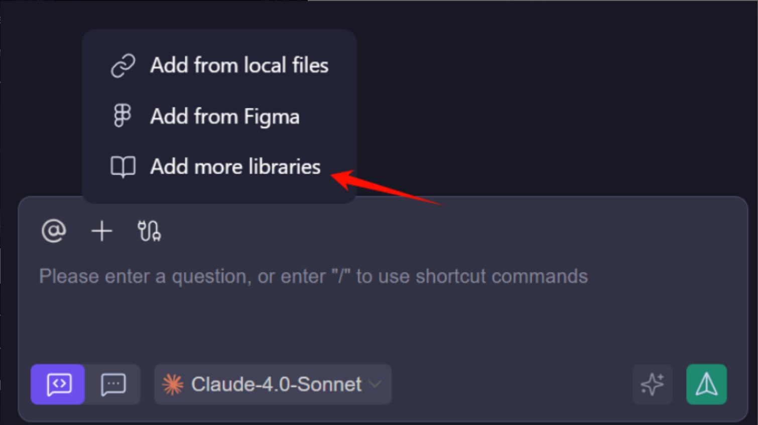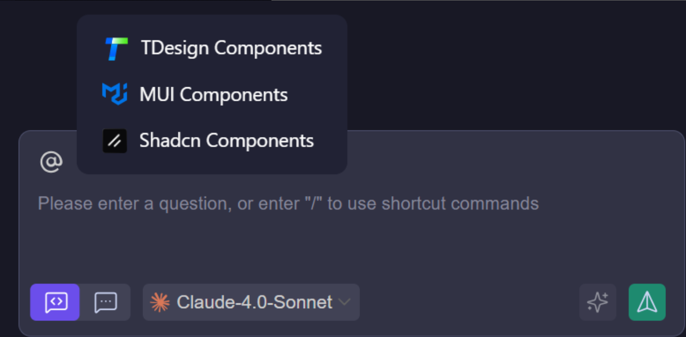 选择您需要的组件后,该组件库就会自动添加到对话上下文中,而且在对话过程中不可修改组件,因此您需要首先根据任务确定好组件库。选择组件后您在输入框中描述您的任务需求即可,例如: