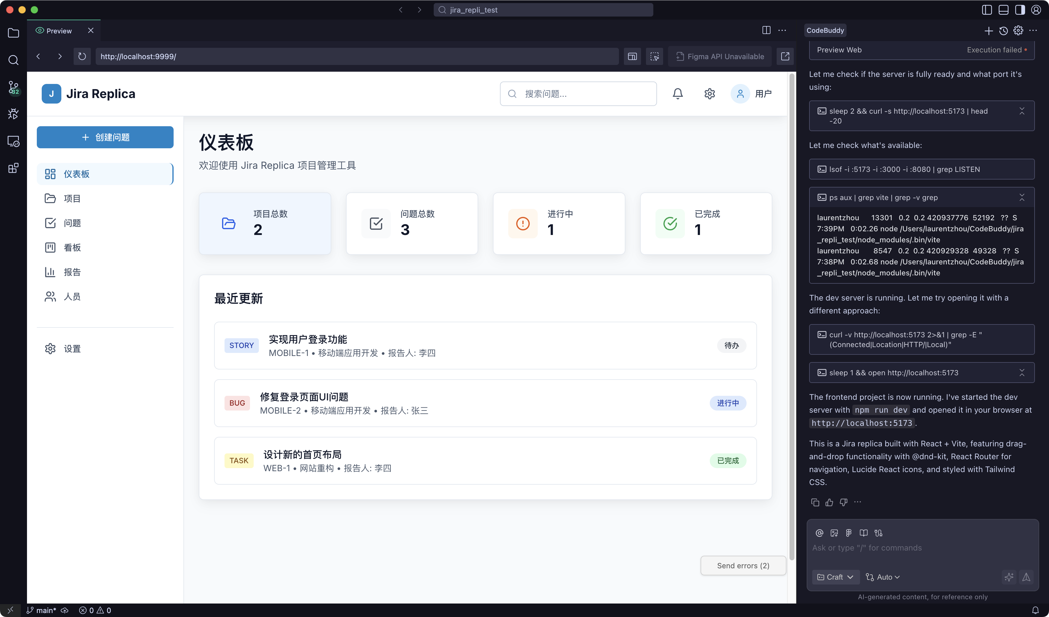 CodeBuddy IDE 支持通过浏览器内核自动渲染代码修改后的运行效果,允许您在不切换工具、不手动启动服务的情况下,即时查看当前工程代码的运行效果,实现 实时调试和预览。