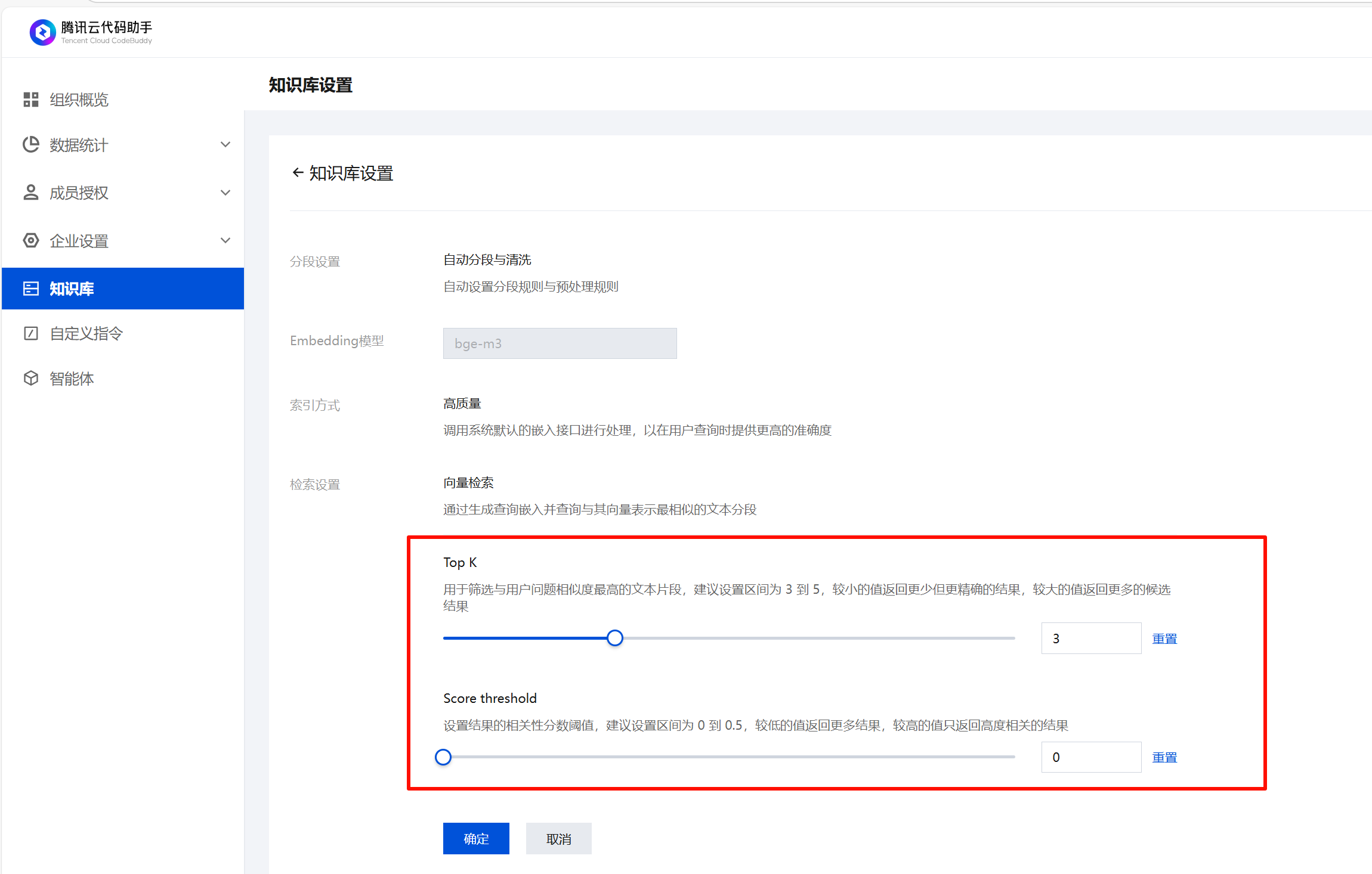 在腾讯云代码助手后台,进入知识库 > 自定义知识库 > 具体自定义知识库 > 设置路径下可以对自定义知识库的检索进行配置,配置页面及配置项解释如下: