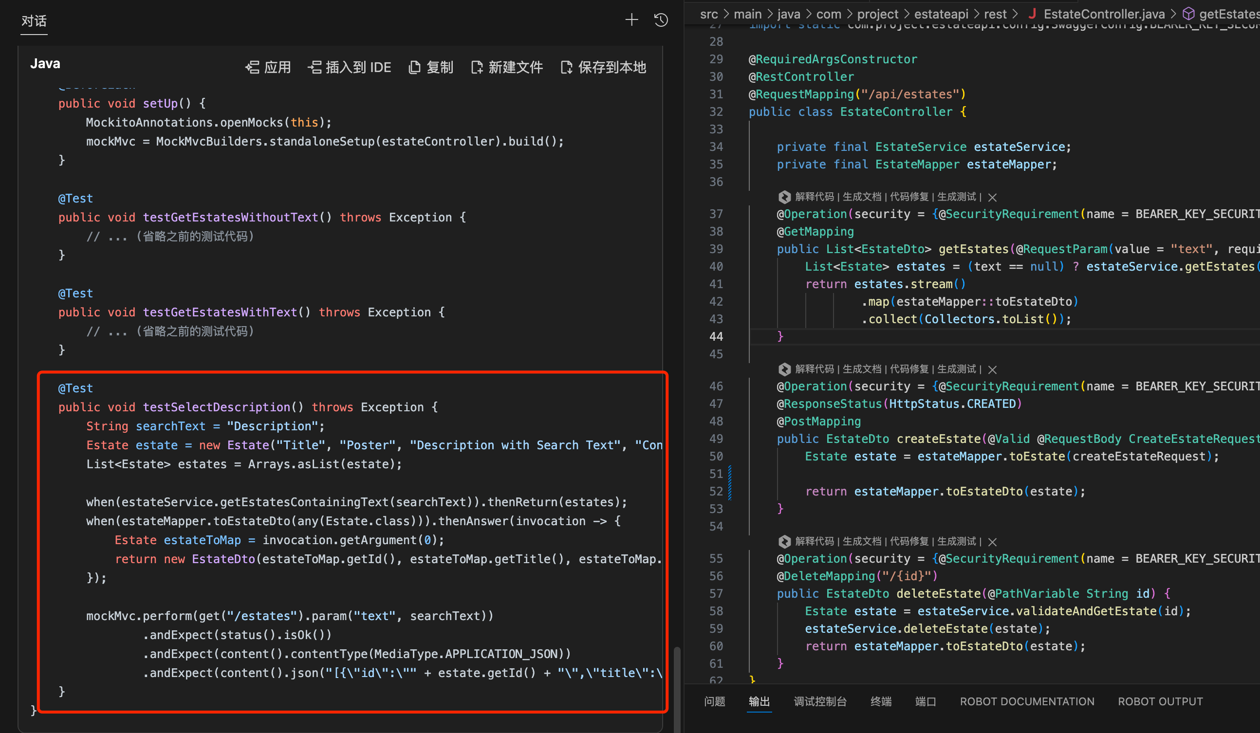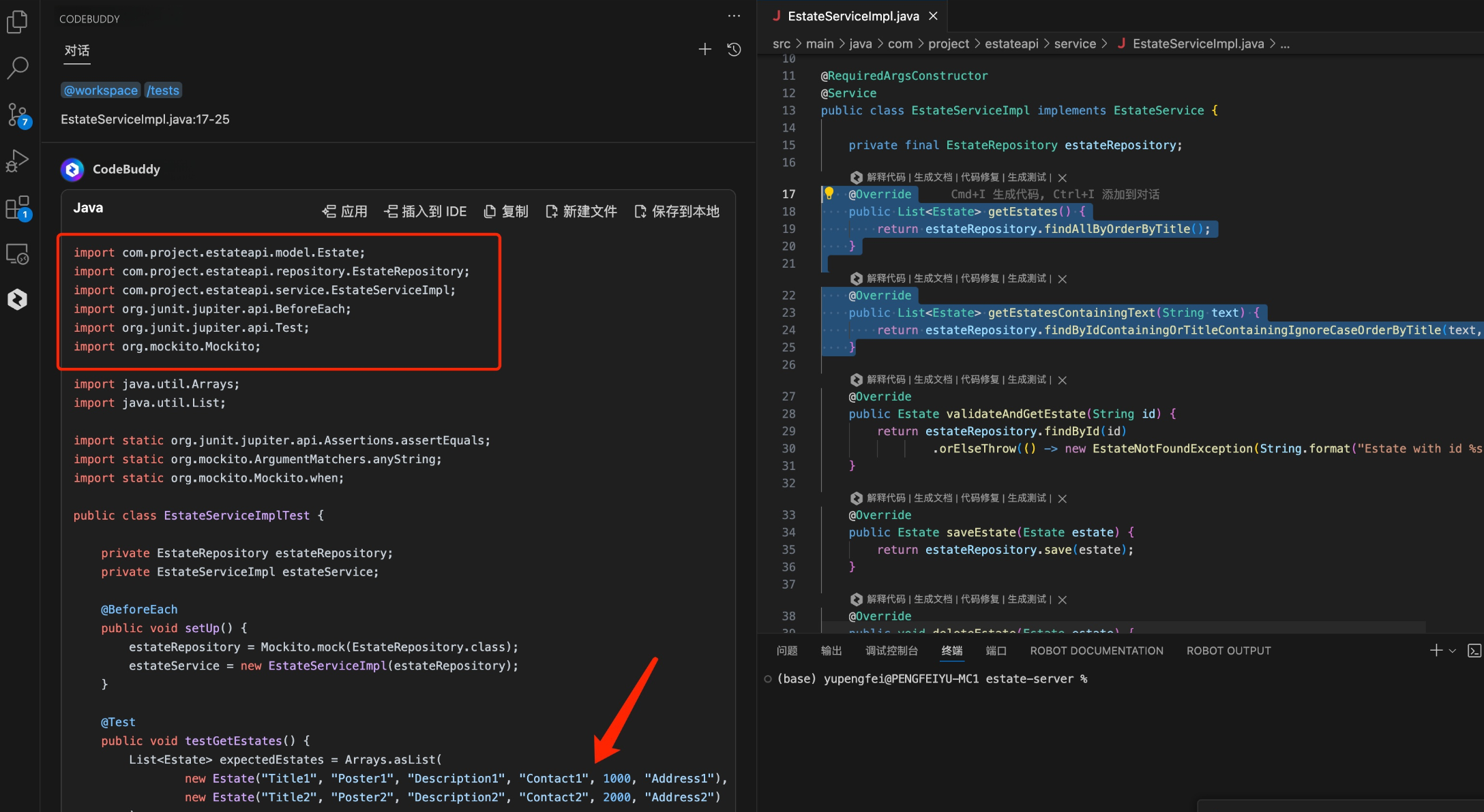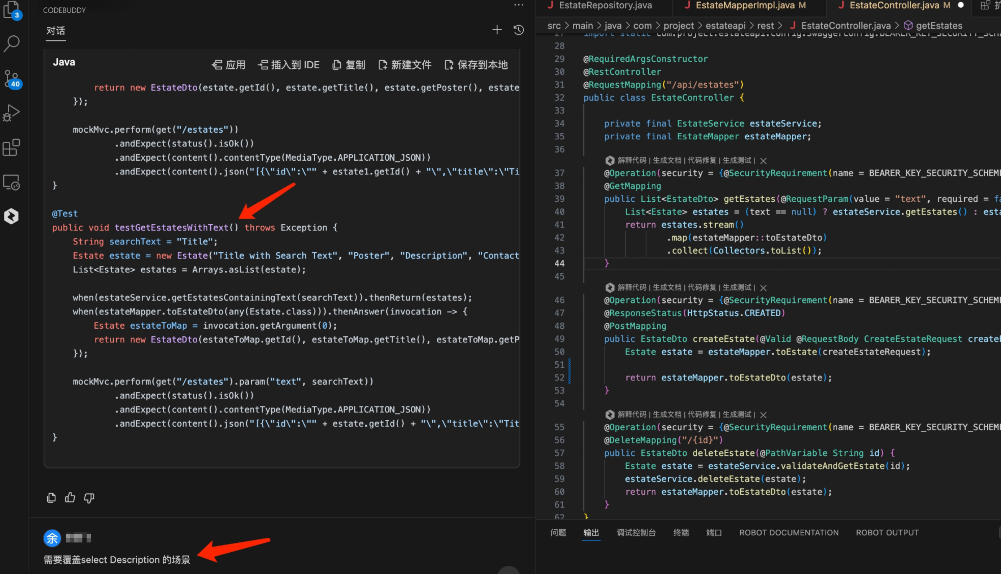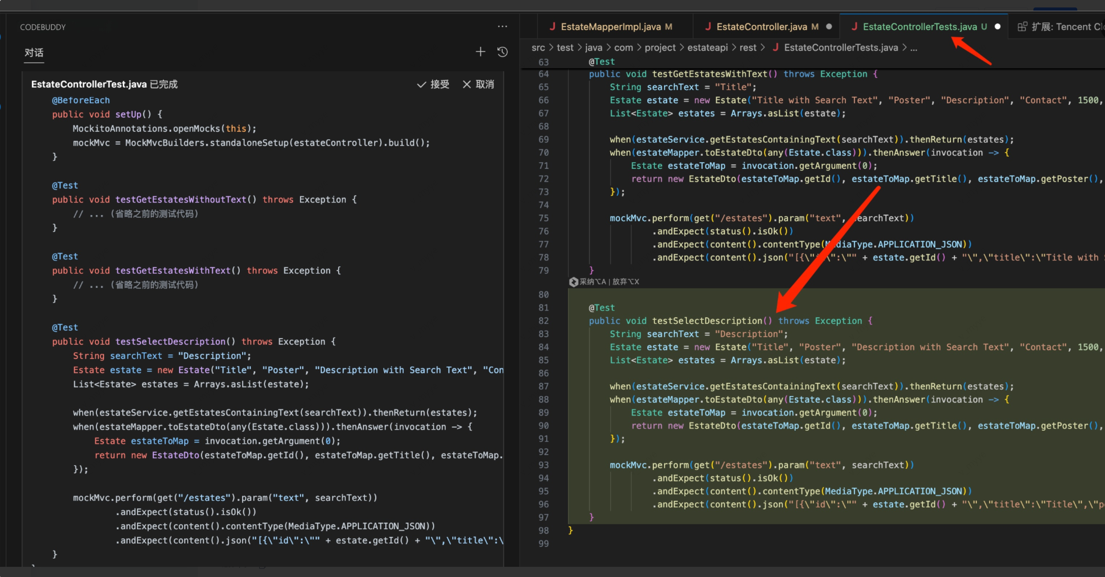 我们选中 getEstates 和 getEstatesContainingText 方法之后,使用 /test 为其生成单元测试代码。在结果中可以看到,腾讯云代码助手在生成单元测试的时候,会分析代码的工程结构,并在生成的时候智能 import 相关依赖;在生成测试代码的时候,会结合其他文件中的类和方法定义生成测试计划,并准确构造测试数据。如下图所示: