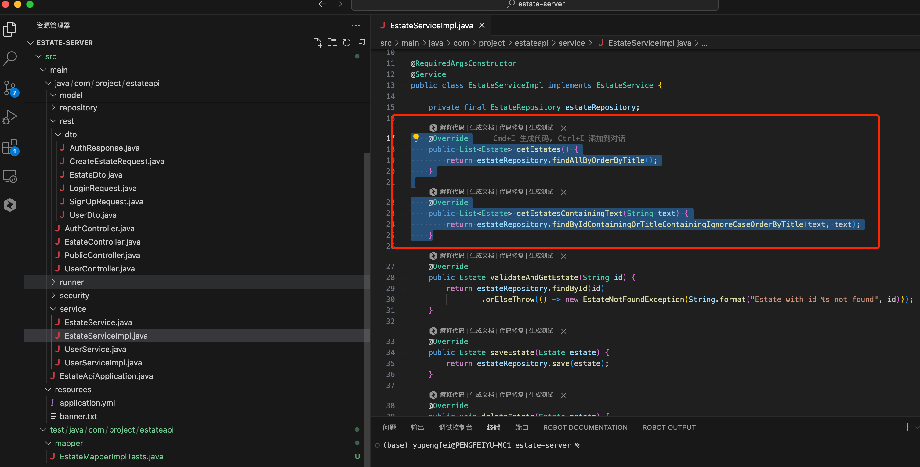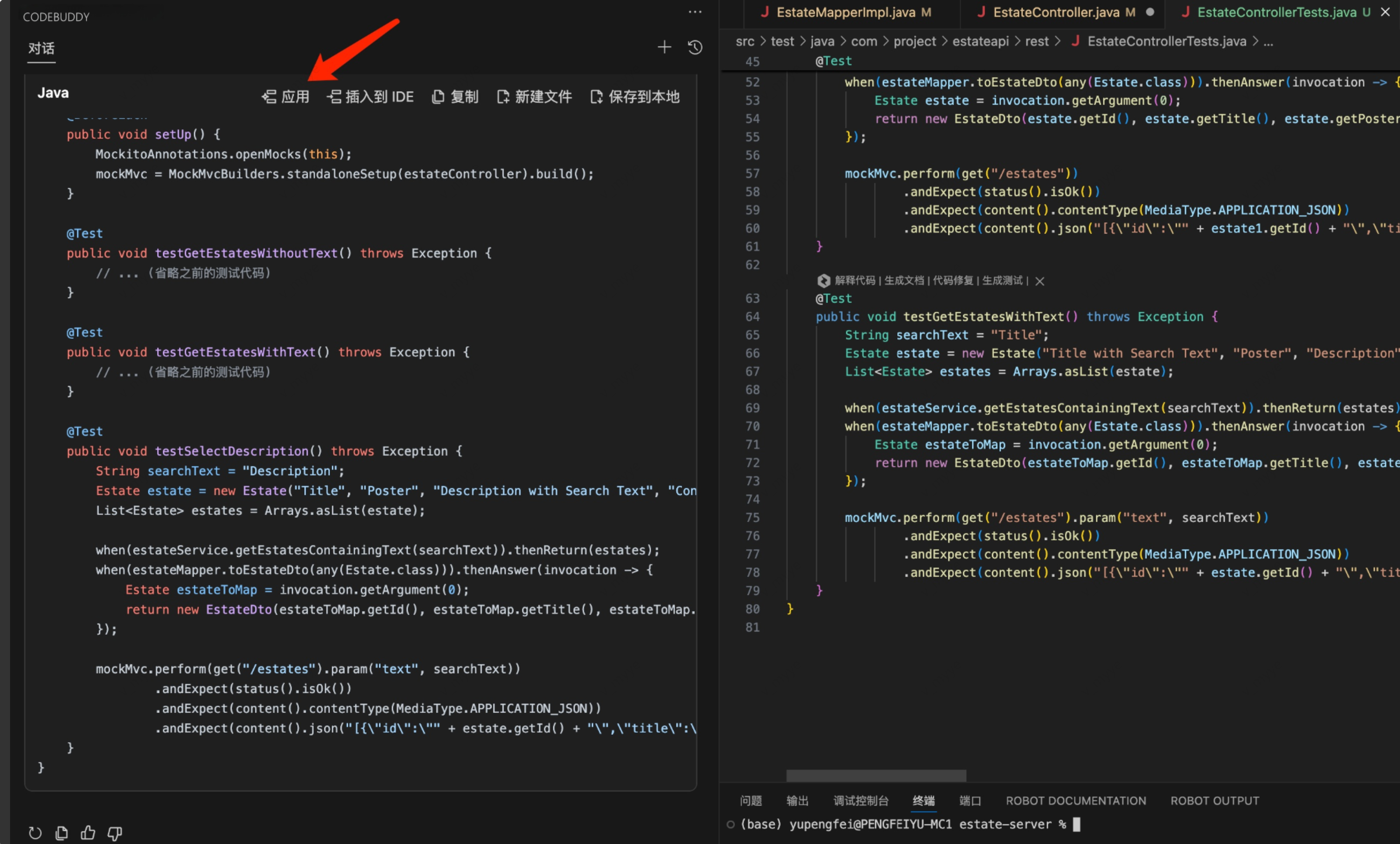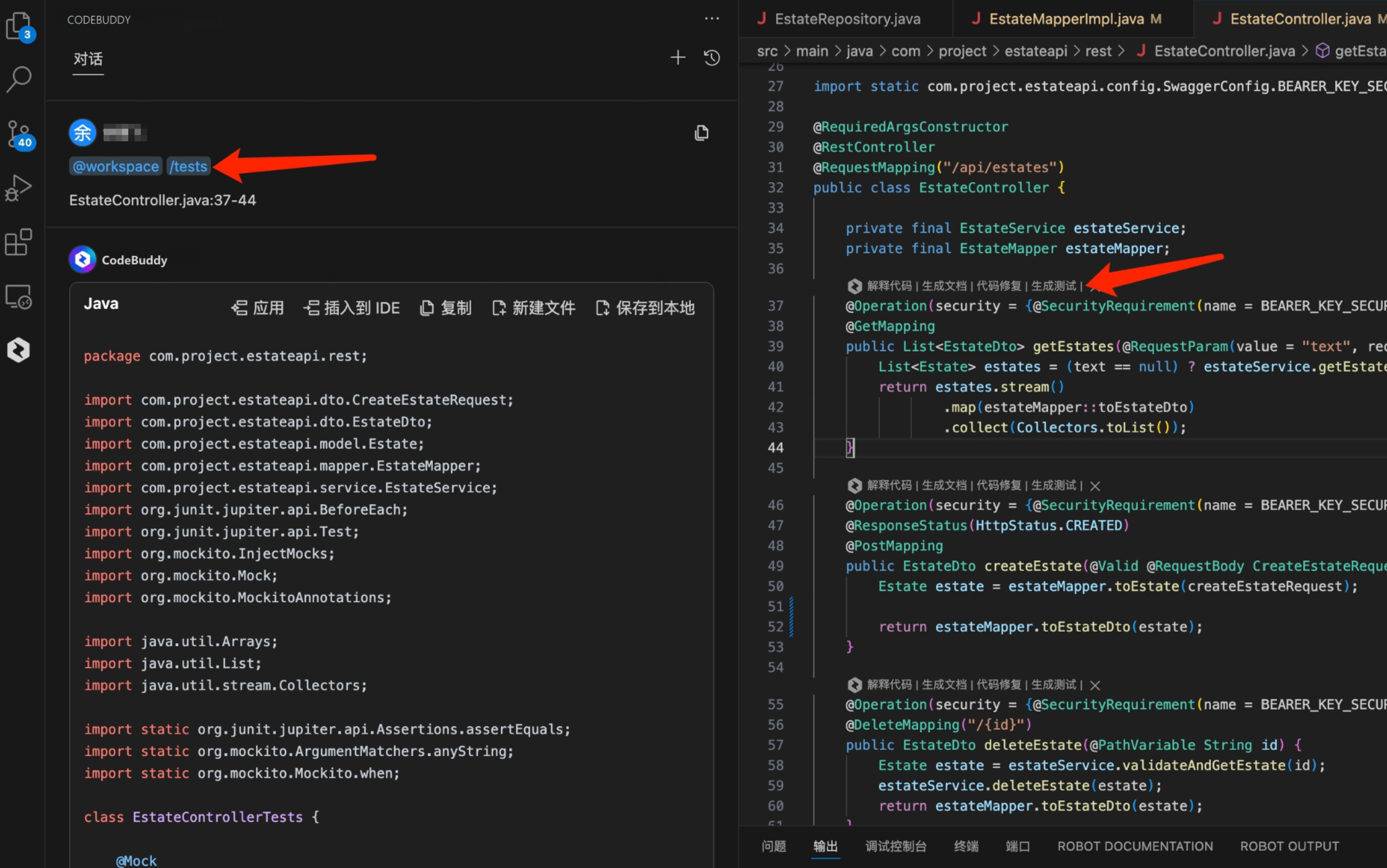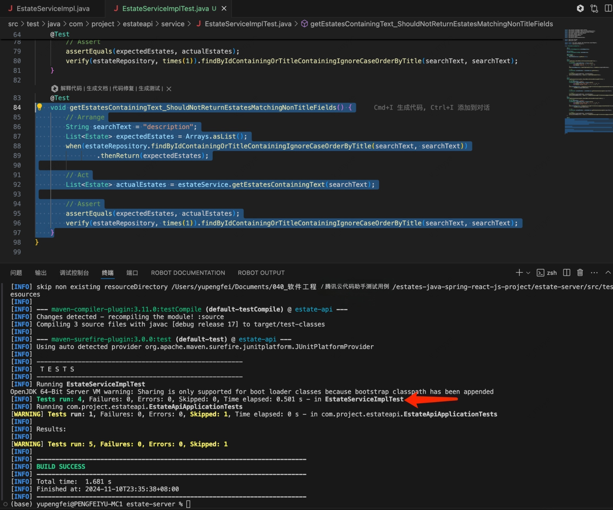 我们选中 getEstates 和 getEstatesContainingText 方法之后,使用 /test 为其生成单元测试代码。在结果中可以看到,腾讯云代码助手在生成单元测试的时候,会分析代码的工程结构,并在生成的时候智能 import 相关依赖;在生成测试代码的时候,会结合其他文件中的类和方法定义生成测试计划,并准确构造测试数据。如下图所示: