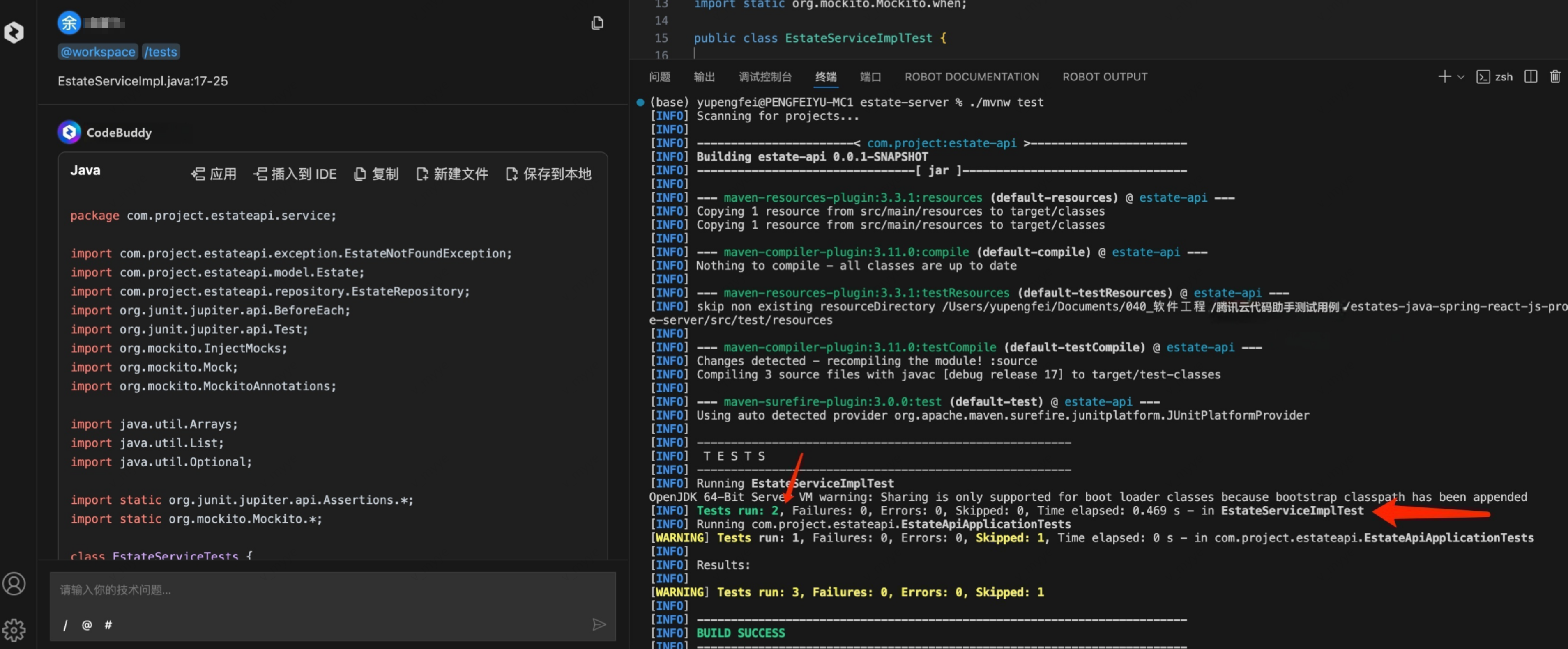 将生成的单元测试内容,插入到指定单元测试文件中,可以直接执行 mvn test 命令进行单元测试验证,如下图所示可以看到这里生成的代码可以编译通过,并完成单元测试功能。