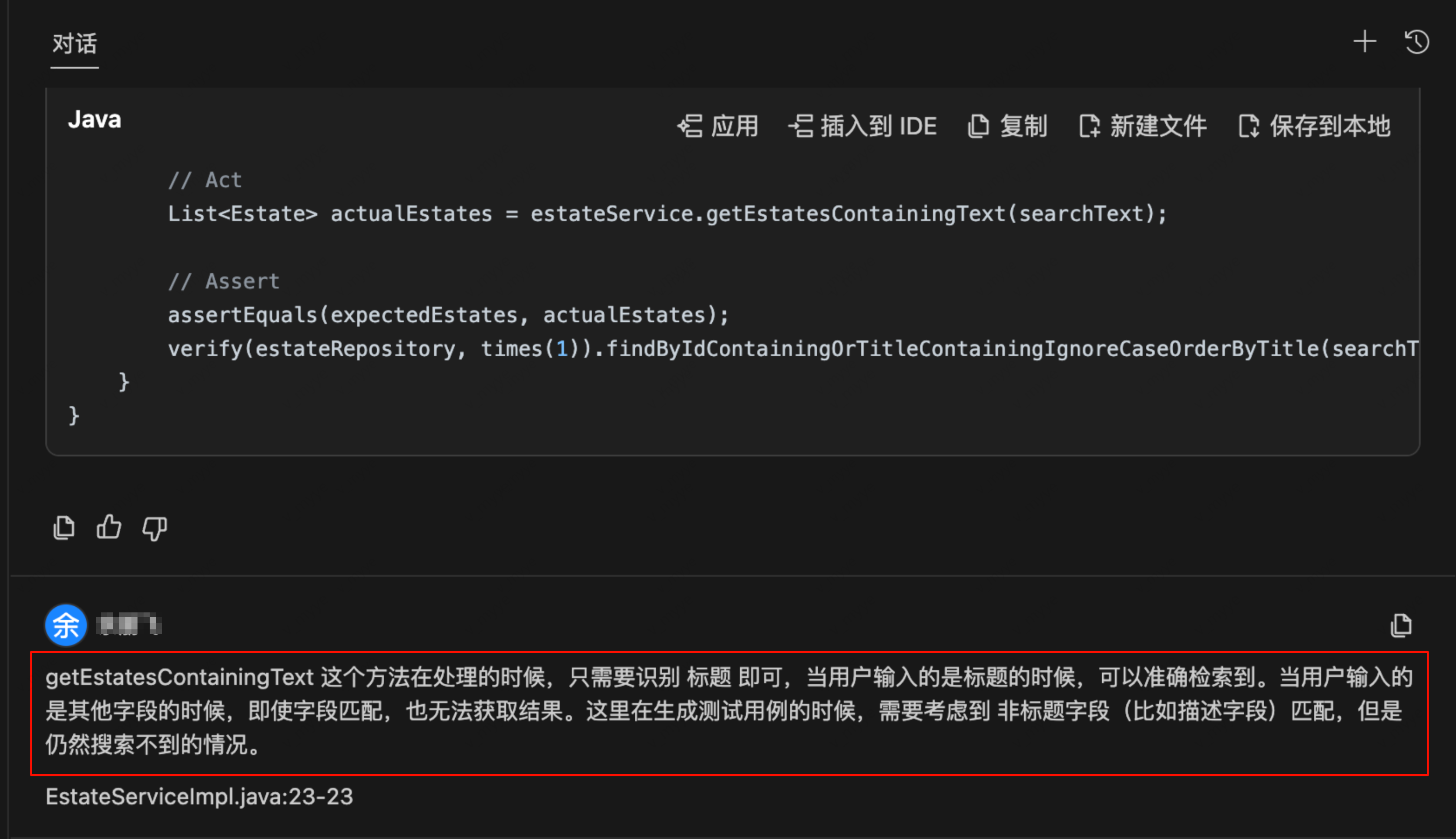 一键应用生成的单元测试内容。 通过对话框生成结果中的快捷按钮,包括应用、插入到 IDE、复制、新建文件、保存到本地,开发者可以快速判断和接受生成的单元测试代码。如下图所示: