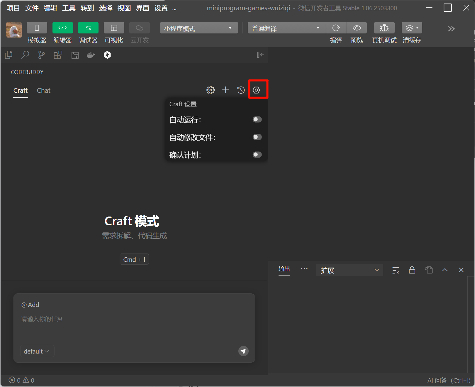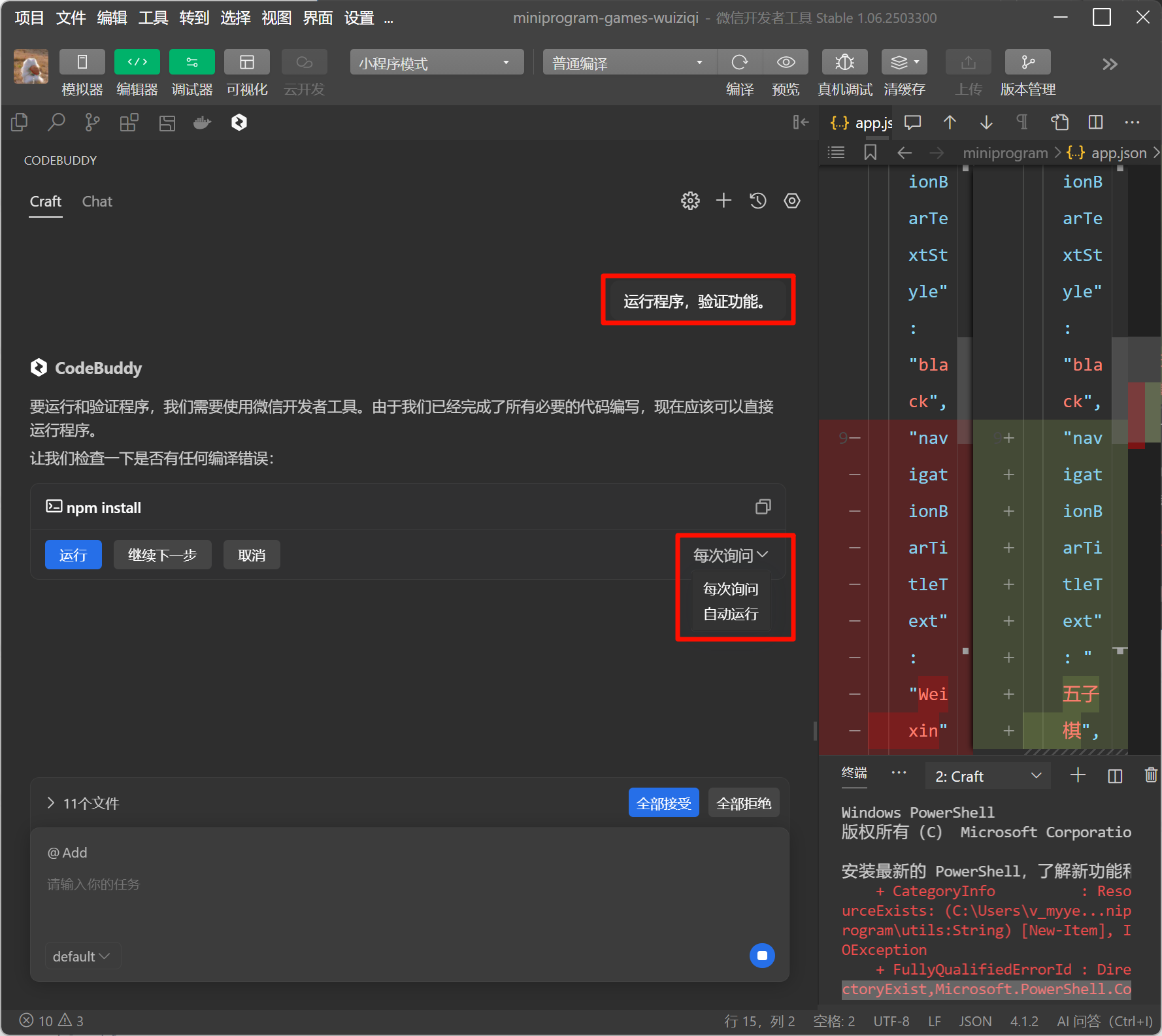 接下来,运行程序,验证程序是否有编译错误。当输入运行程序的需求后,Craft 会向您询问是否运行。这里有两种模式可以选择:每次询问和自动运行,如果不需要每次向您询问,可以选择设置成自动运行,设置后将全局生效,后续的对话将自动运行。