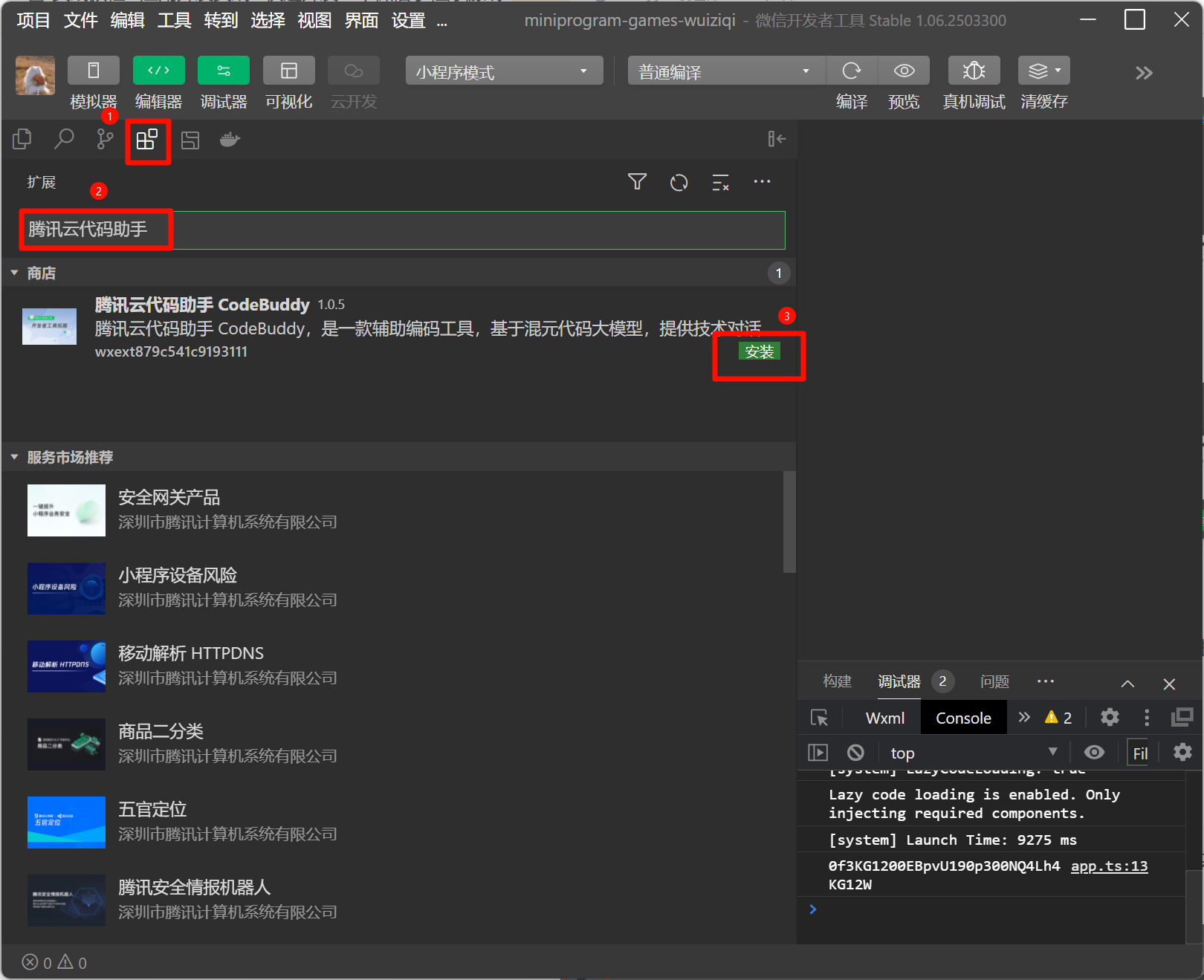 创建完小程序项目后,在扩展中,输入腾讯云代码助手或 **CodeBuddy **安装腾讯云代码助手插件。