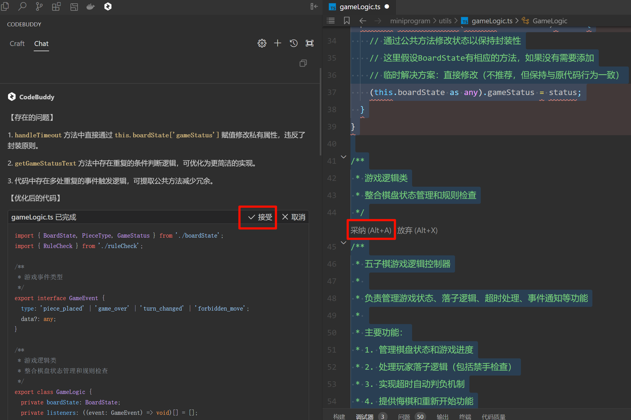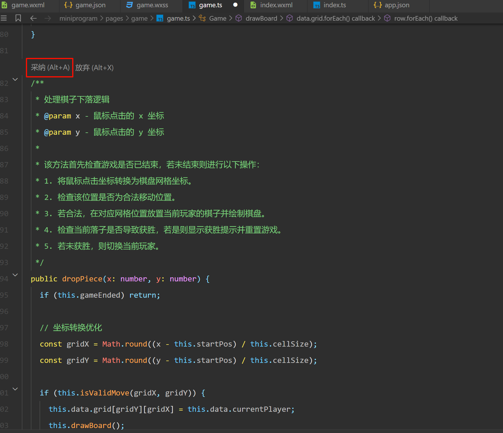 代码助手提供了智能插入的方法,通过大模型为其生成合并的 Diff View 预览效果,如下图,清晰很多了。代码助手在如下视图下可以选择部分采纳或者全部采纳: