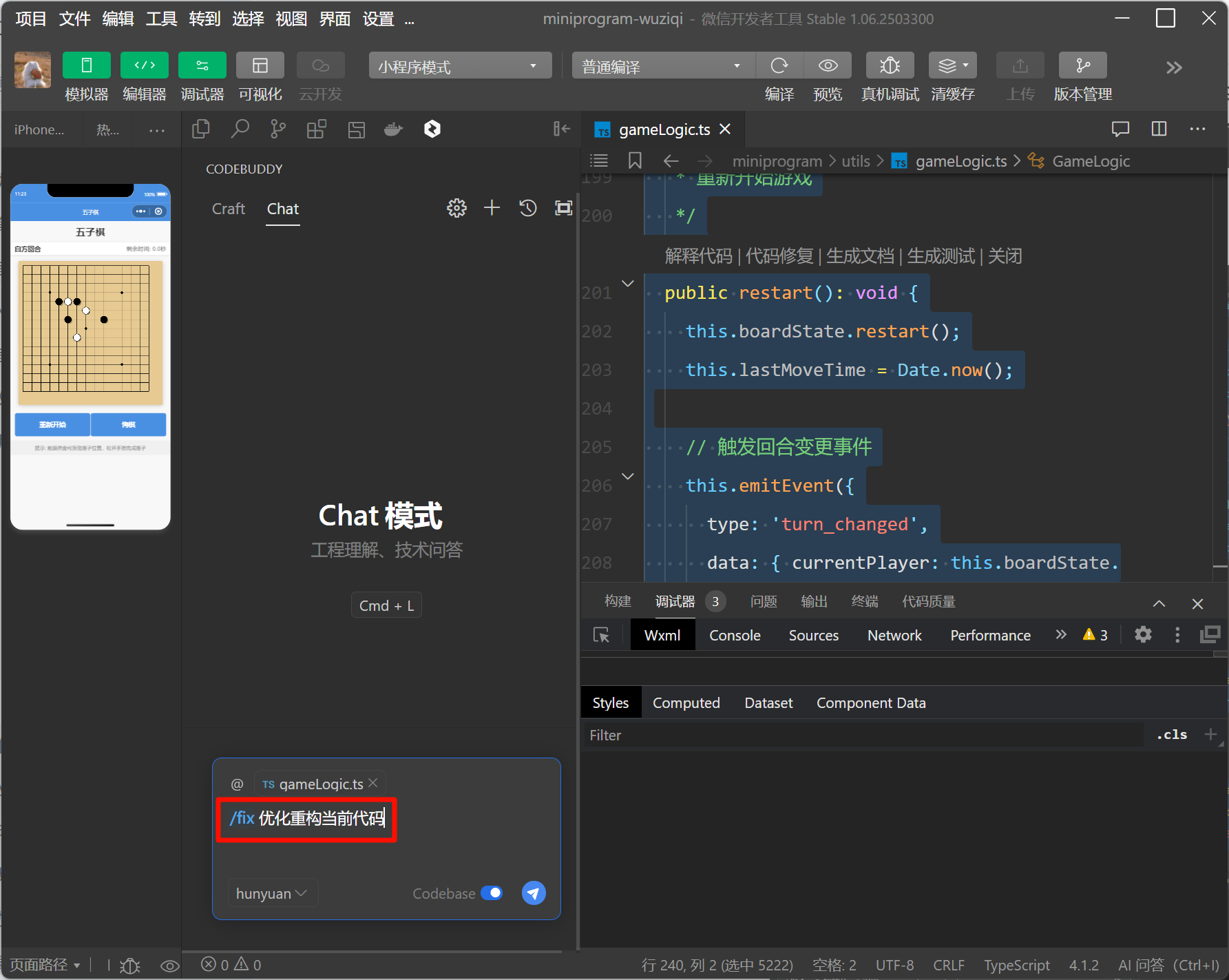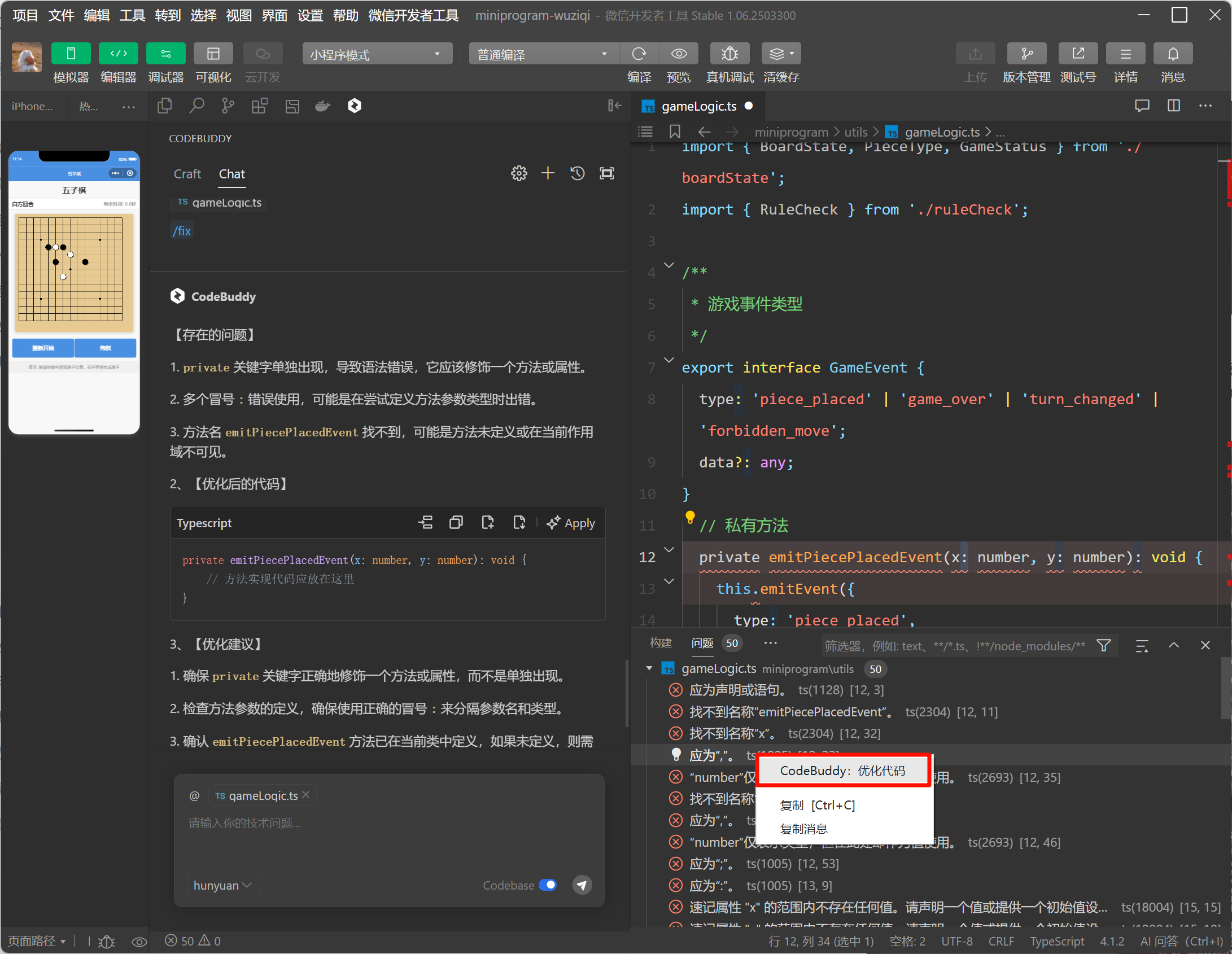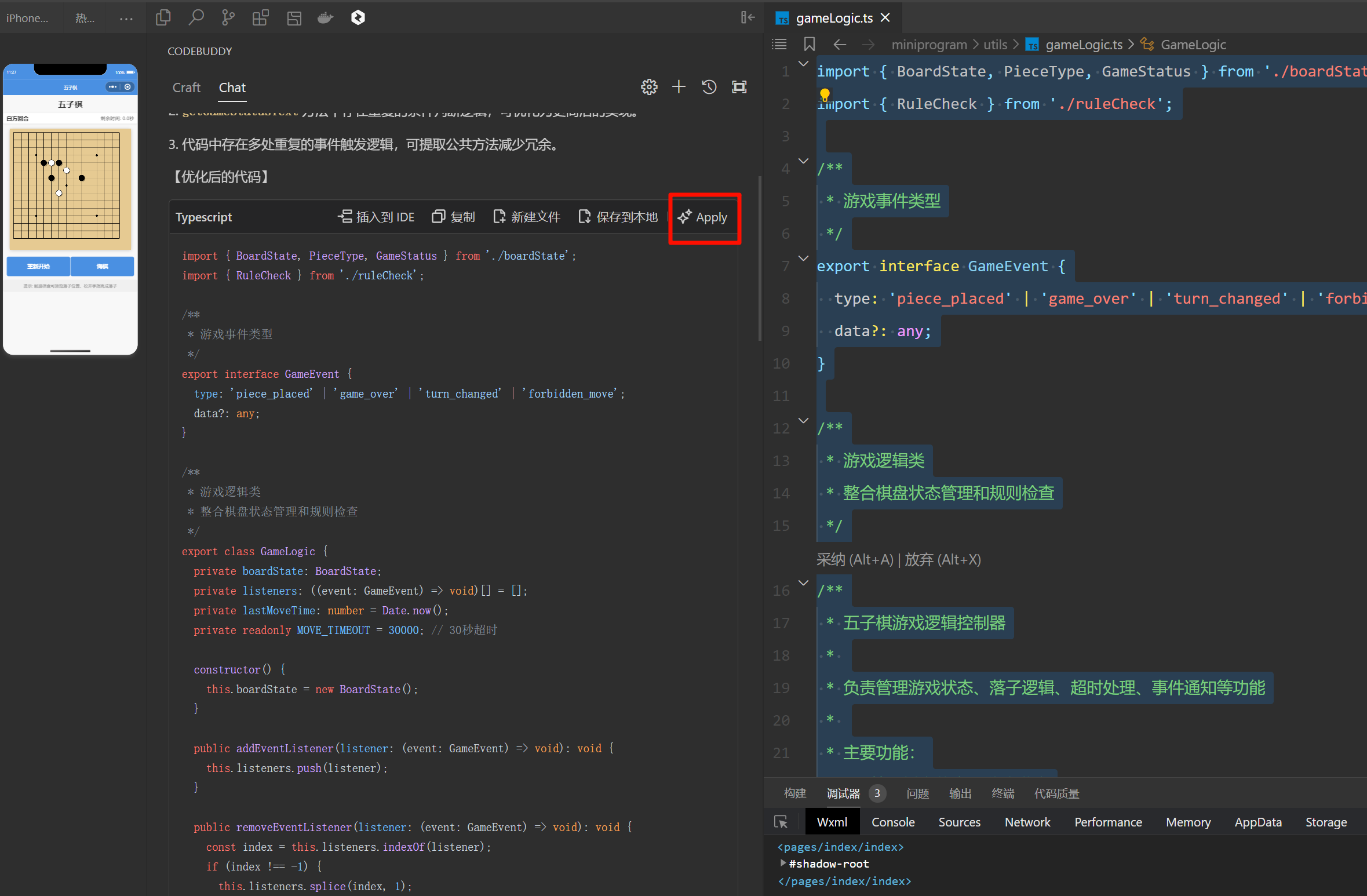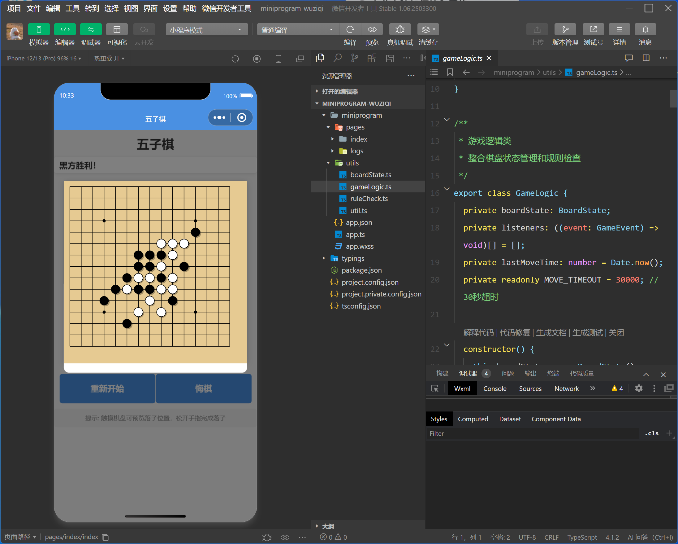 重新编译运行程序,可以看到五子棋的微信小程序游戏可以精准落子,功能正常。您还可以继续基于实际需求进行版本迭代。