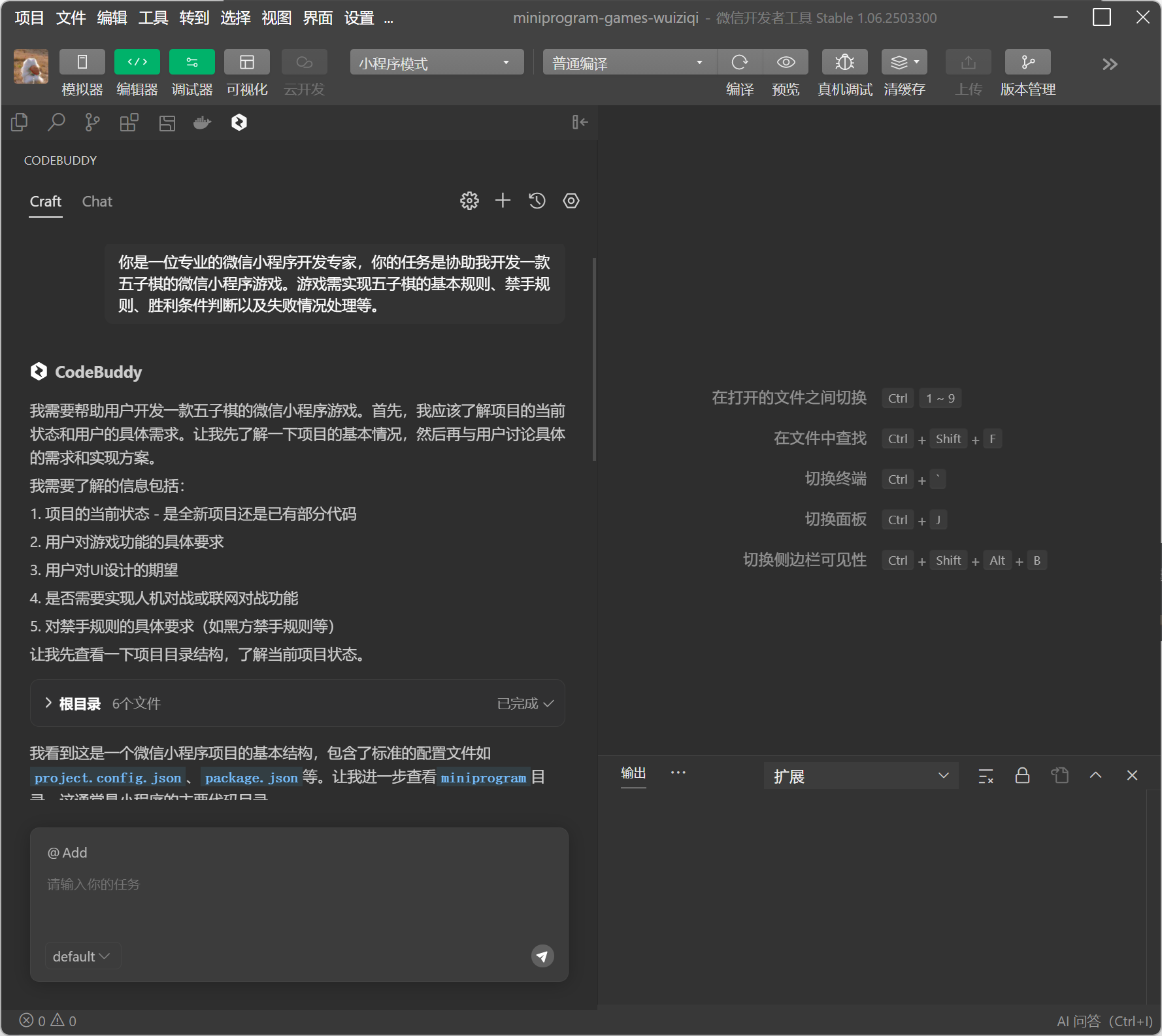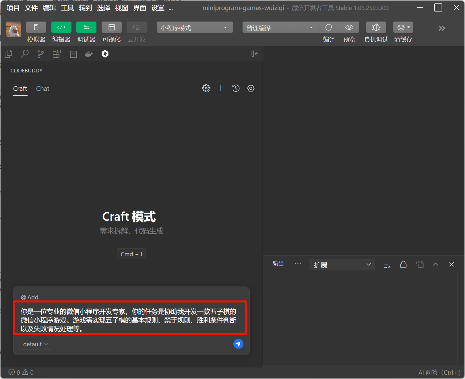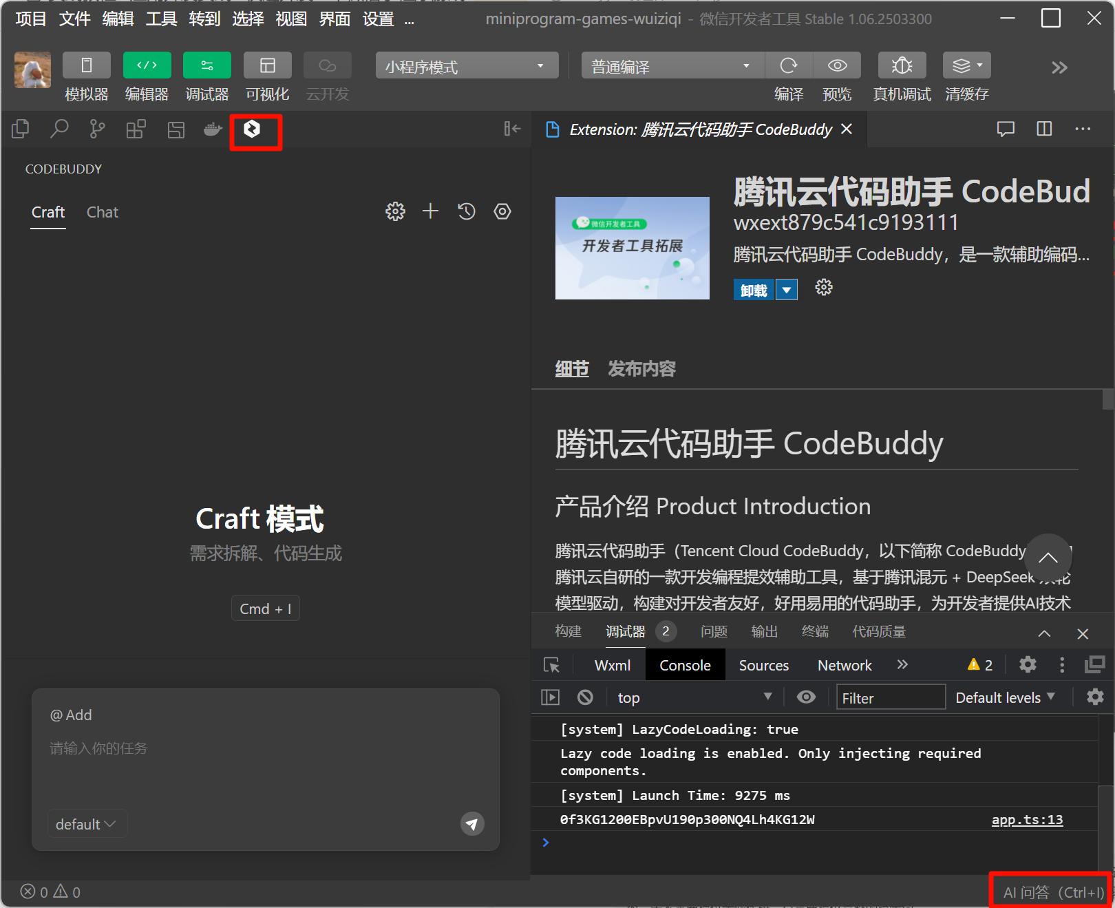 腾讯云代码助手已经支持在微信开发者工具 IDE 下的编码辅助,在代码辅助的效率上有很大提升,通过自然语言描述就可以完成最终应用。并且,支持了全新软件开发智能体 Craft,输入自然语言指令,支持文件多选,AI 深度理解代码工程,自主完成工程多文件代码生成和改写,快速落地可执行应用。现在,为您介绍如何利用软件开发智能体 Craft 来快速开发一个微信小程序游戏—五子棋。