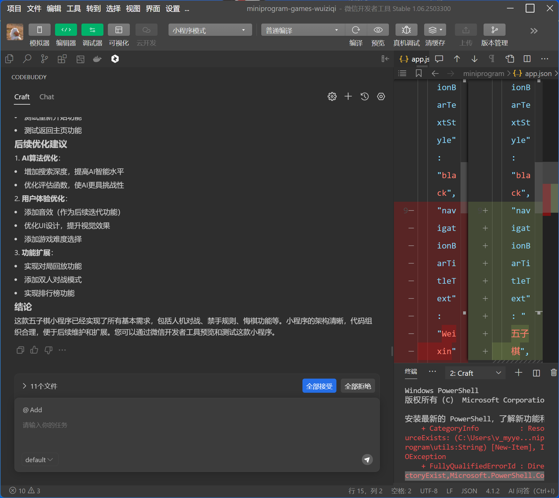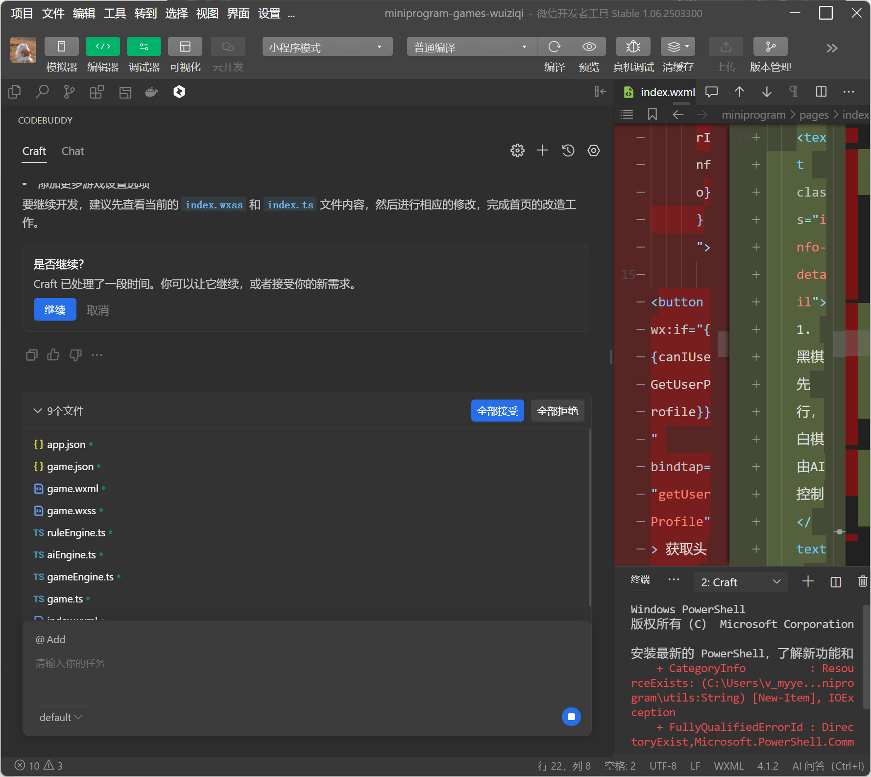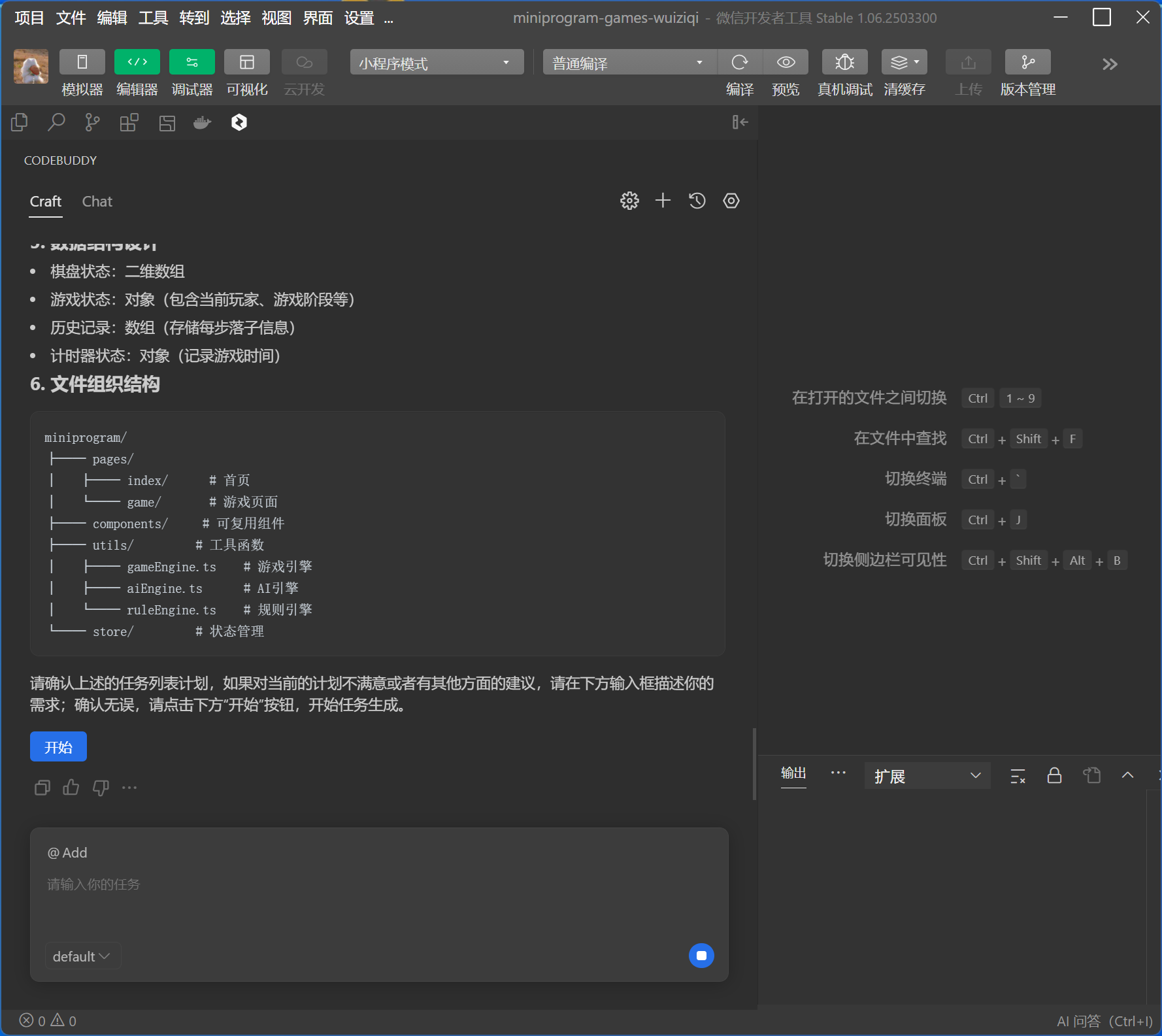 腾讯云代码助手已经支持在微信开发者工具 IDE 下的编码辅助,在代码辅助的效率上有很大提升,通过自然语言描述就可以完成最终应用。并且,支持了全新软件开发智能体 Craft,输入自然语言指令,支持文件多选,AI 深度理解代码工程,自主完成工程多文件代码生成和改写,快速落地可执行应用。现在,为您介绍如何利用软件开发智能体 Craft 来快速开发一个微信小程序游戏—五子棋。