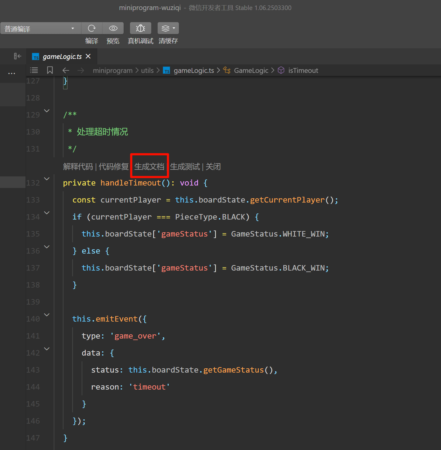 返回代码后,可以在函数头或者鼠标悬浮后出现蓝色提示,单击生成文档,如下图: