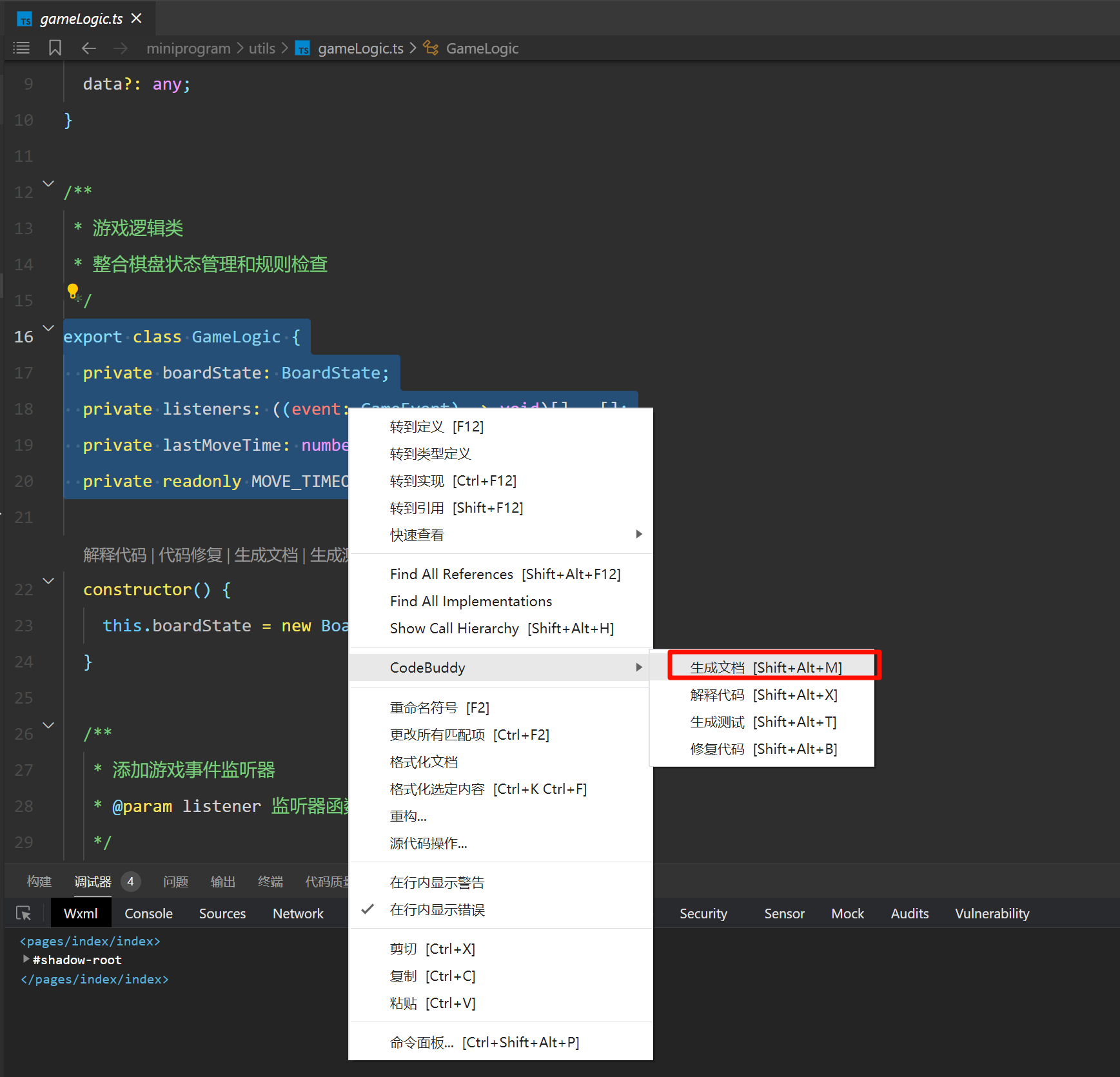 方法一:通过圈选核心代码,右键,选择 CodeBuddy > 生成文档,如下: