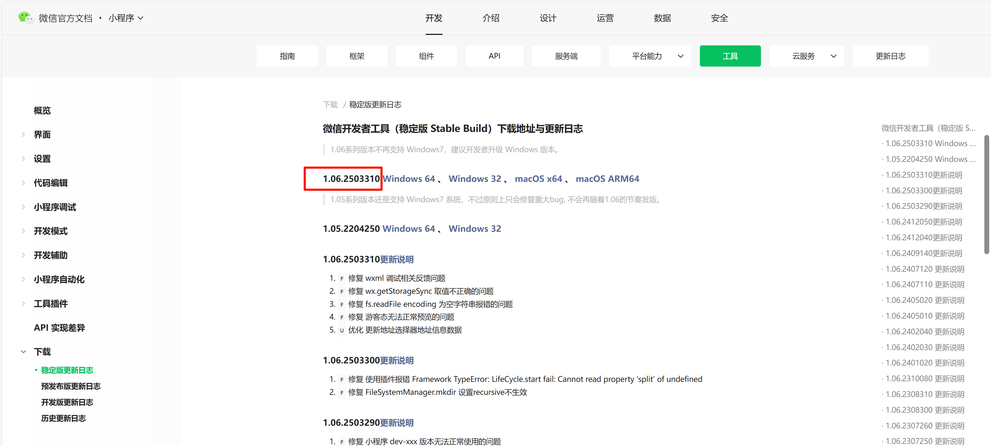 请前往 微信开发者工具下载网址下载微信开发者工具并安装,建议下载最新稳定版即可,例如现在的最新稳定版是 1.06.2503310。