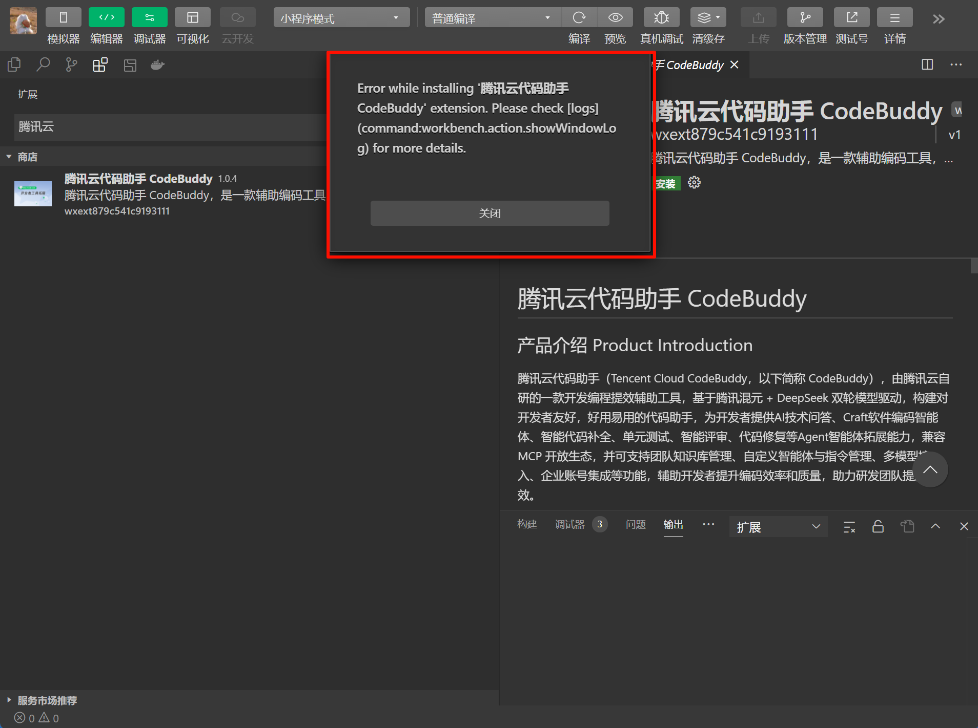 安装插件完成后,建议重启一下微信开发者工具;如果出现安装异常,例如下图所示,可参考不同端功能常见问题进行解决。