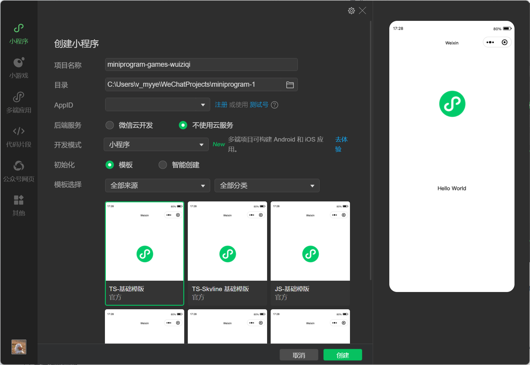 后端服务:因为小程序游戏还不需要后端,所以这里选择了不使用云服务。