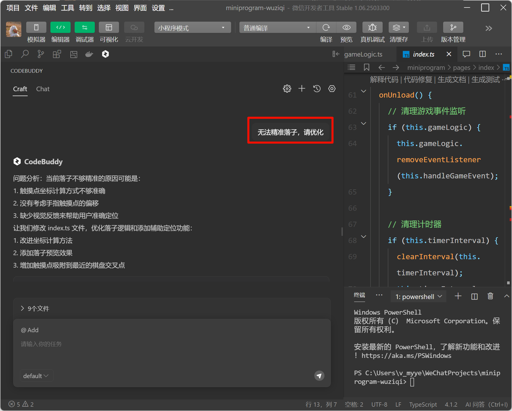 编译运行程序后,发现无法精准落子,此时可以继续输入问题与 Craft 进行对话,让 Craft 继续优化代码。