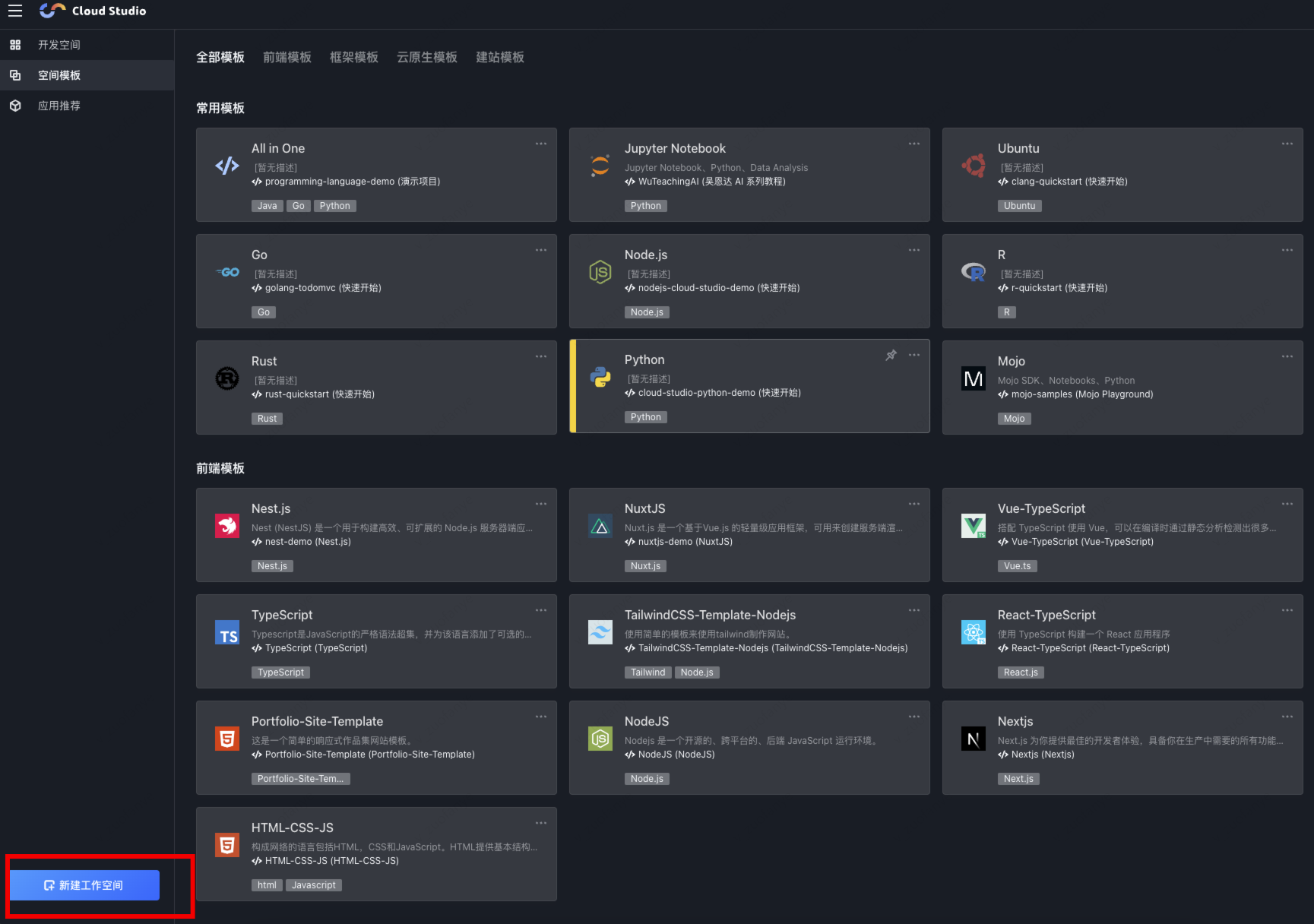 打开 腾讯云 Cloud Studio,单击左下角新建工作空间。