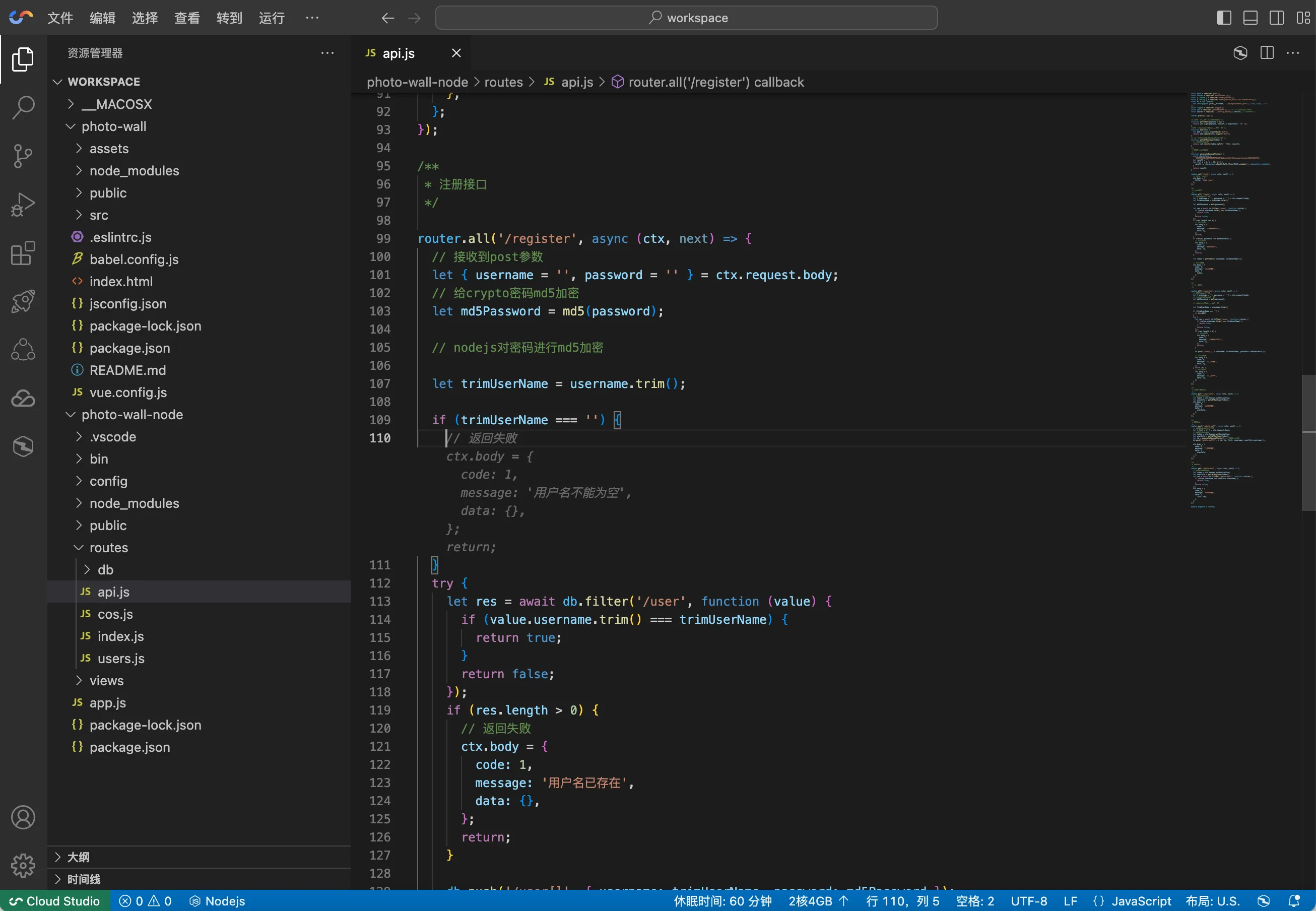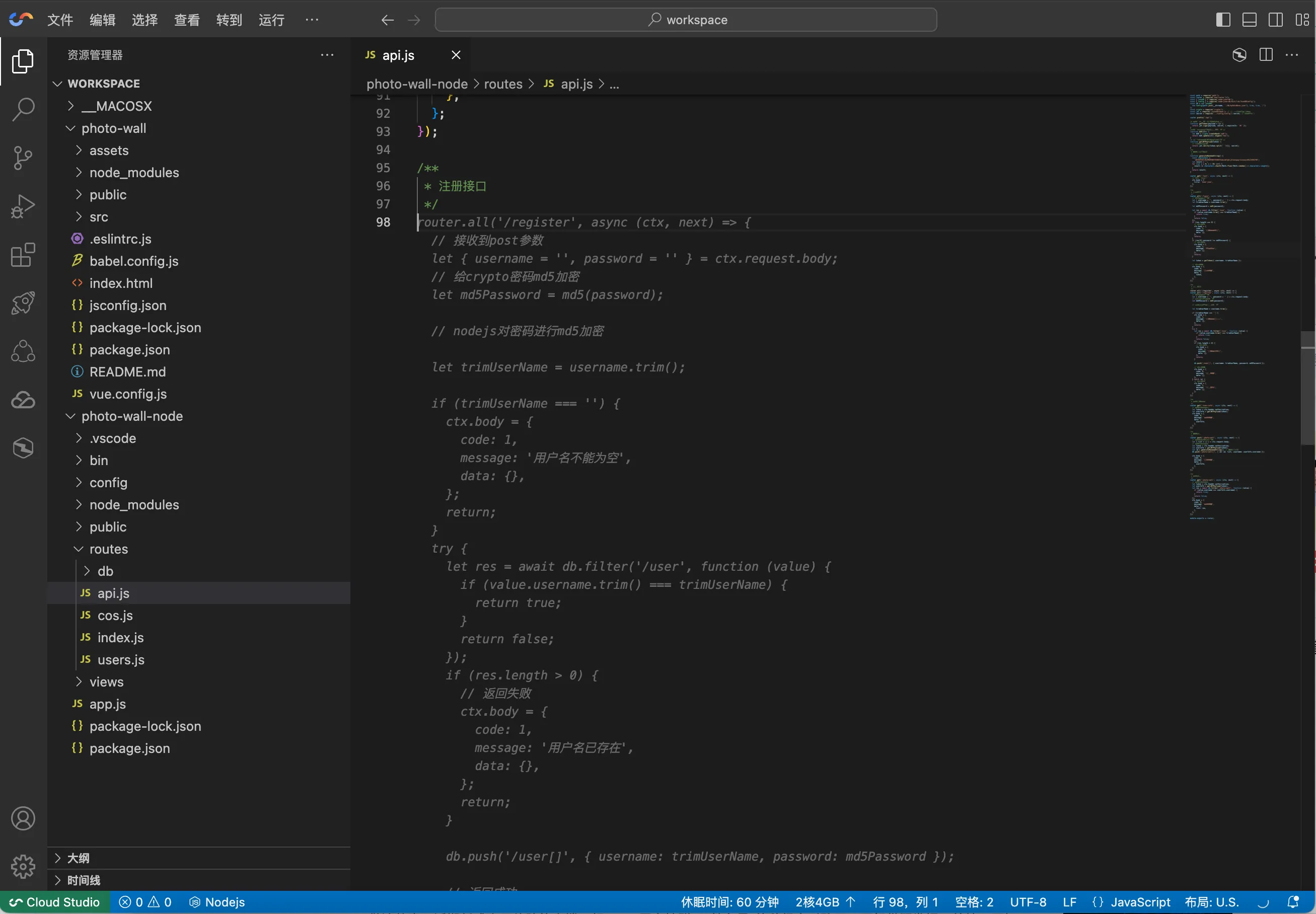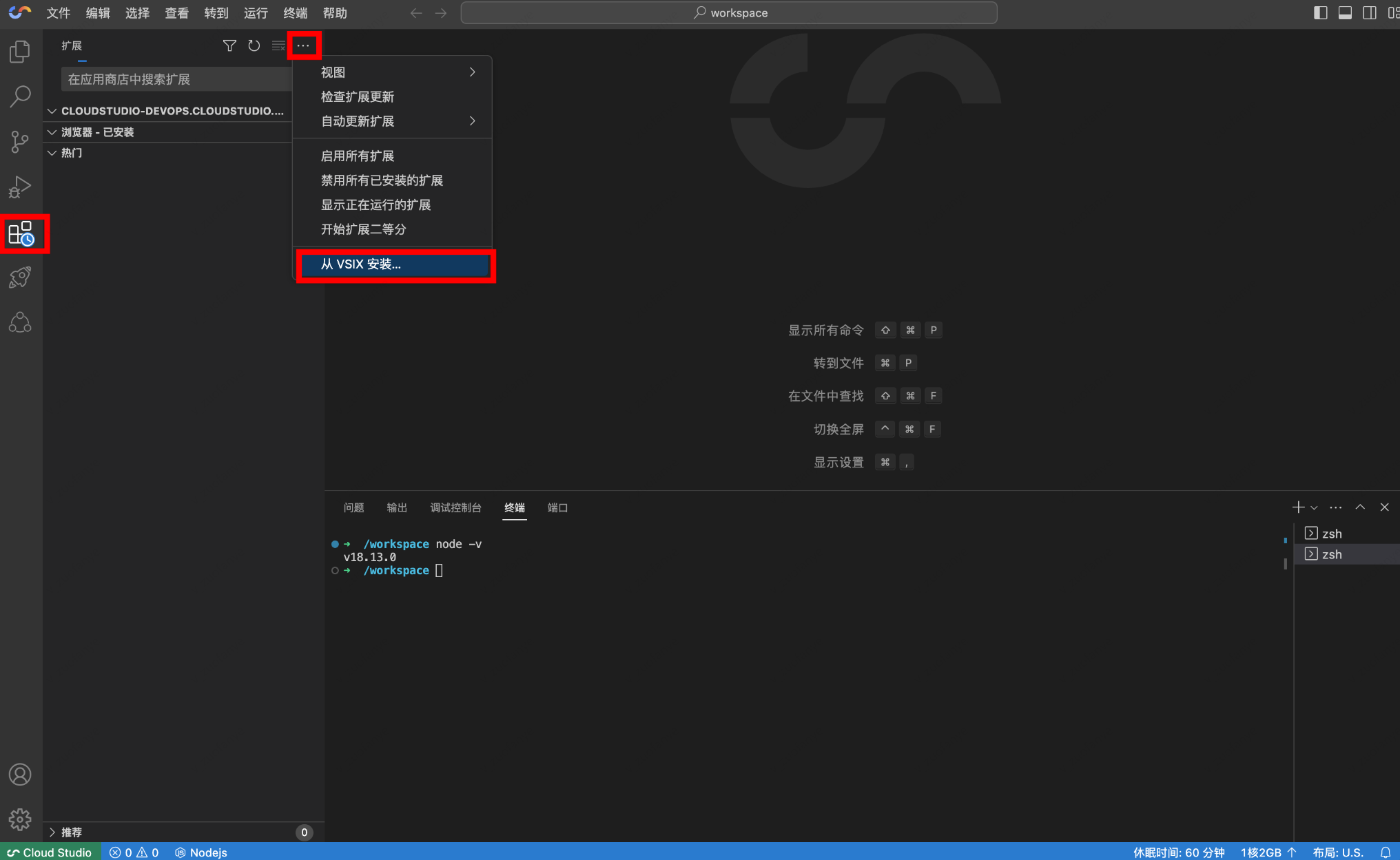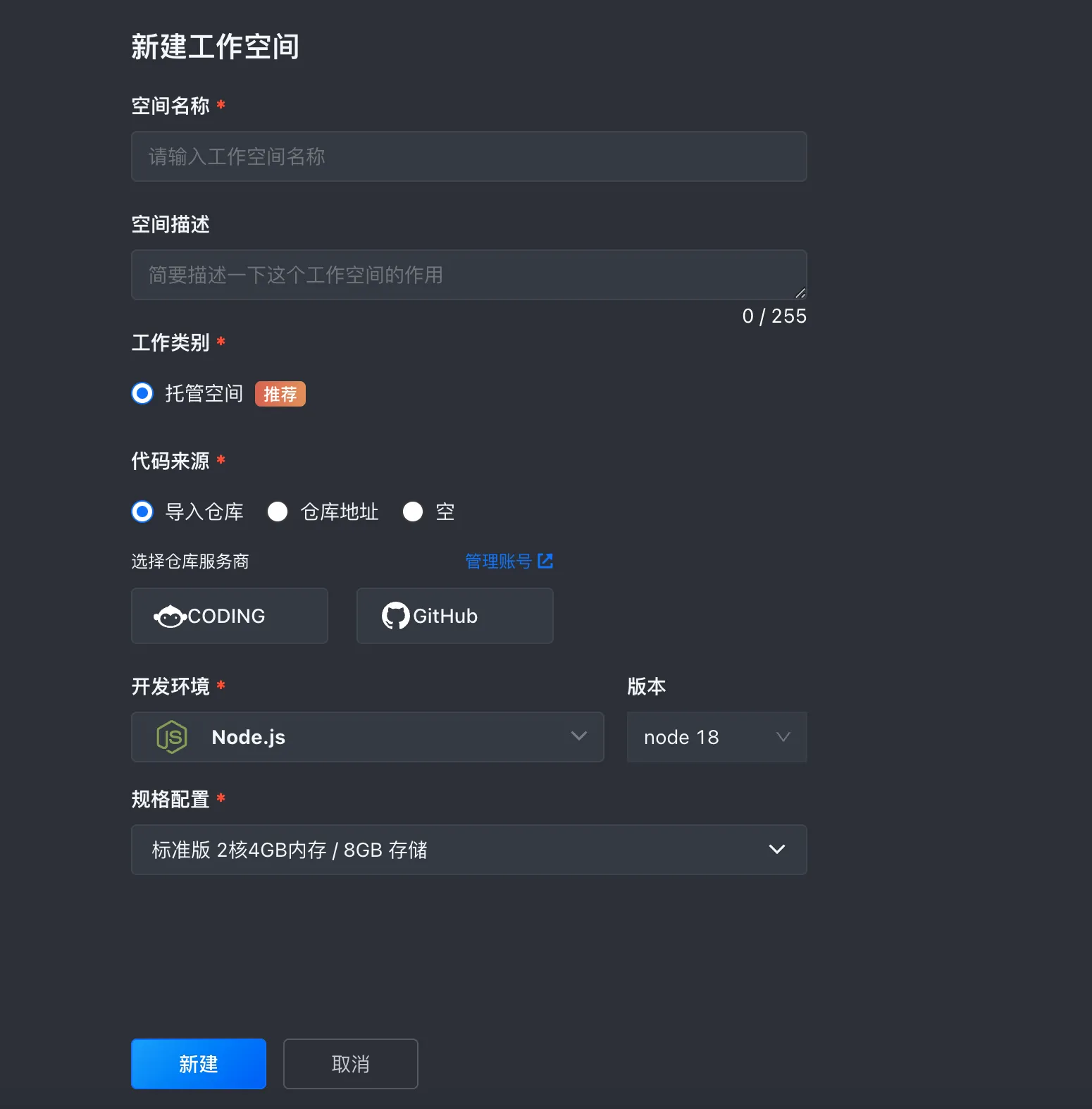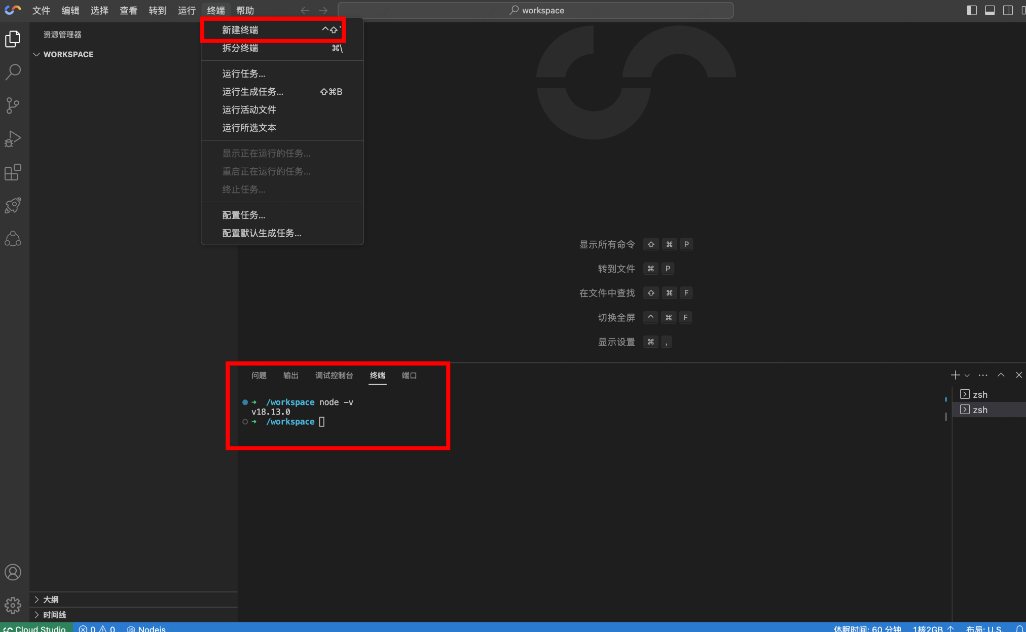 选择一个 Node.js 开发环境,单击新建之后,即可进入开发环境。