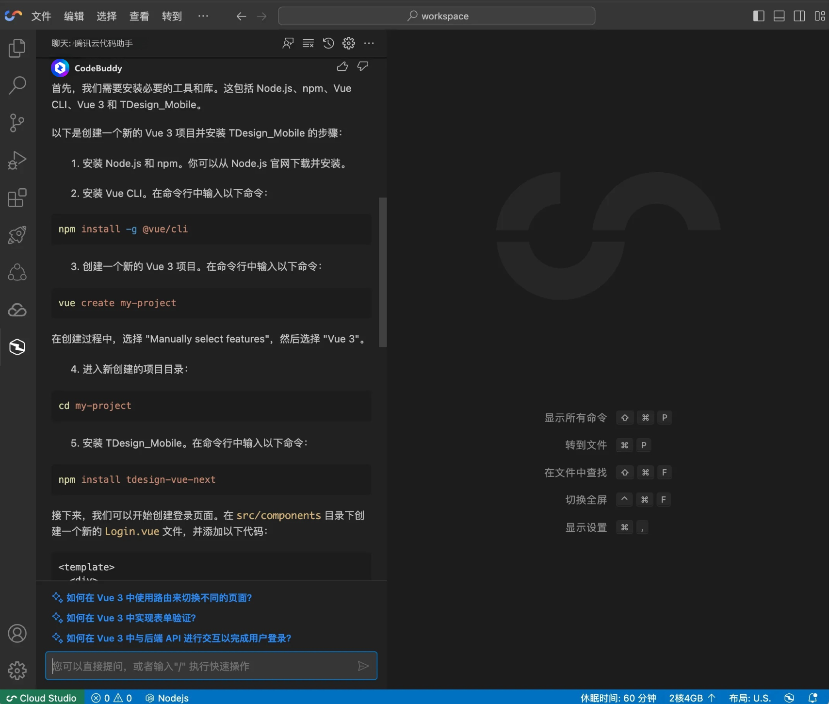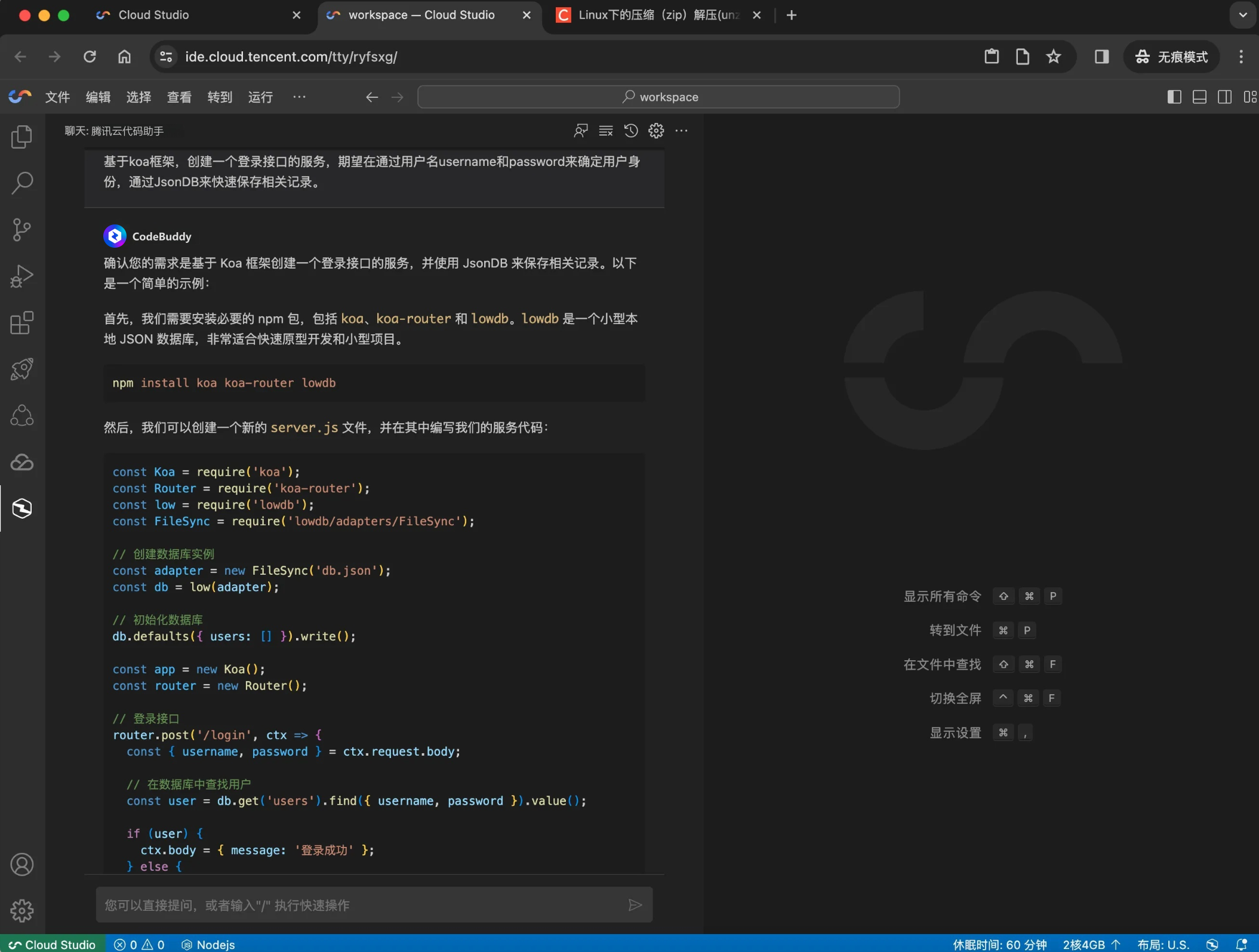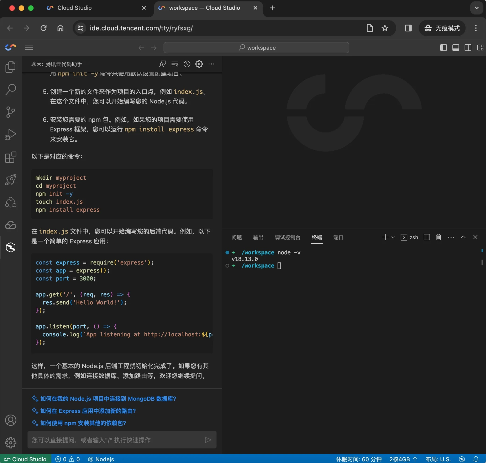 接下来开始创建 Node.js 后端服务。基于代码助手的对话能力,输入提示词初始化一个 Node.js 项目的后端工程。