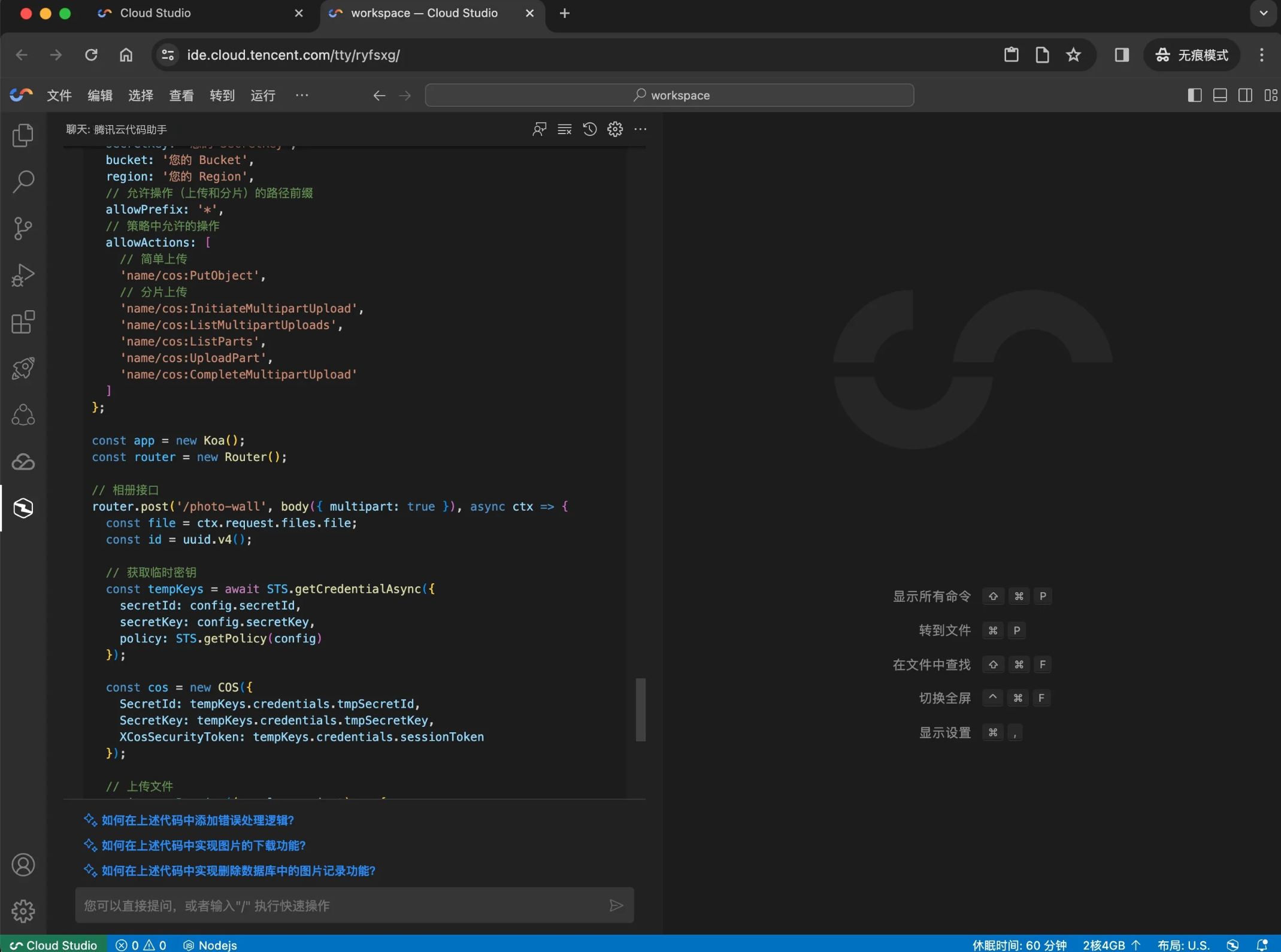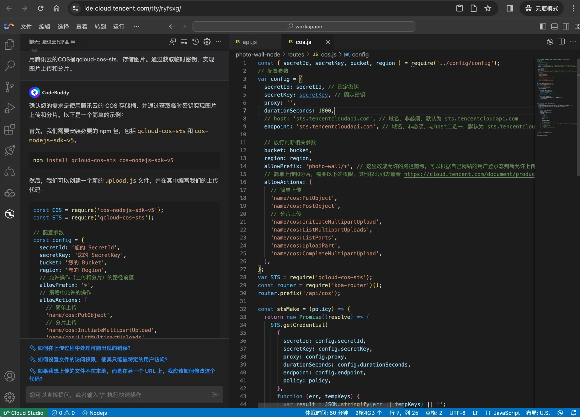 上传的图片需要存放到 COS 桶,接下来向代码助手提问:用腾讯云的 COS 桶 qcloud-cos-sts,存储图片。通过获取临时密钥,实现图片上传和分片。