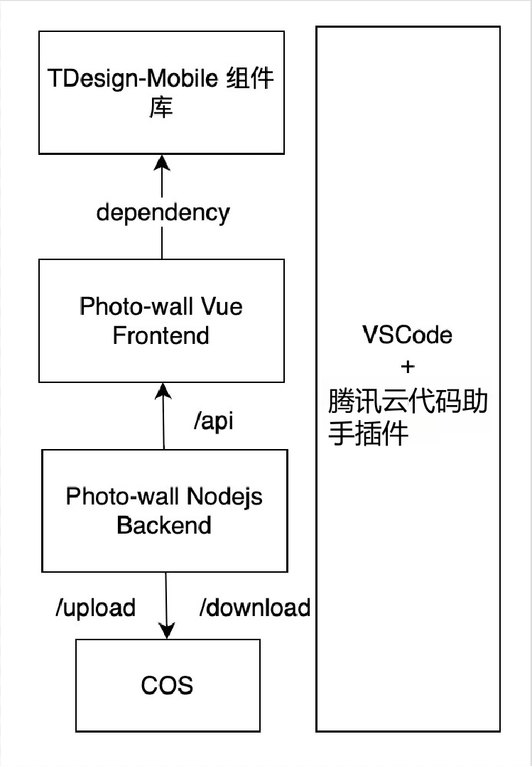 后端采用了 Node.js+ 数据库。数据库用于记录 ID 等 COS 文件信息。图片的 raw data 通过 COSClient SDK 存入 COS 桶中。