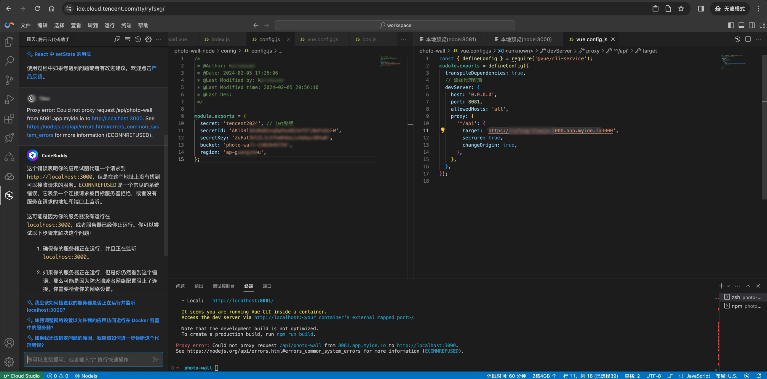 在 Cloud IDE 里遇到了问题,例如转发问题和 AllowHost 问题,可以通过代码助手对话解决。