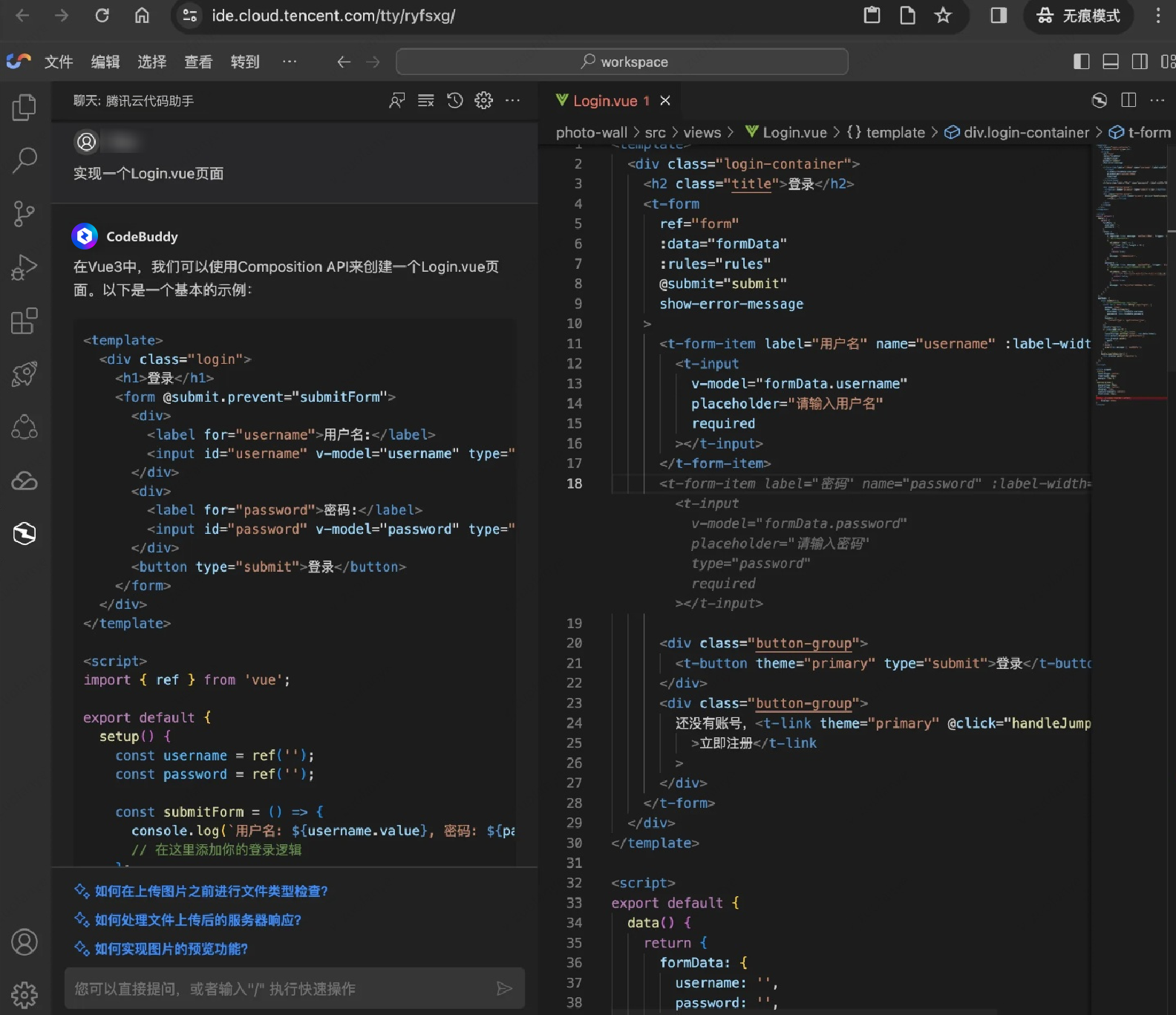 创建对应几个 Vue 文件,如图,通过对话实现一个 Login.vue 页面先去生成个大概。然后通过插入代码之后,再进行代码补全微调,从而生成自己想要的代码逻辑。