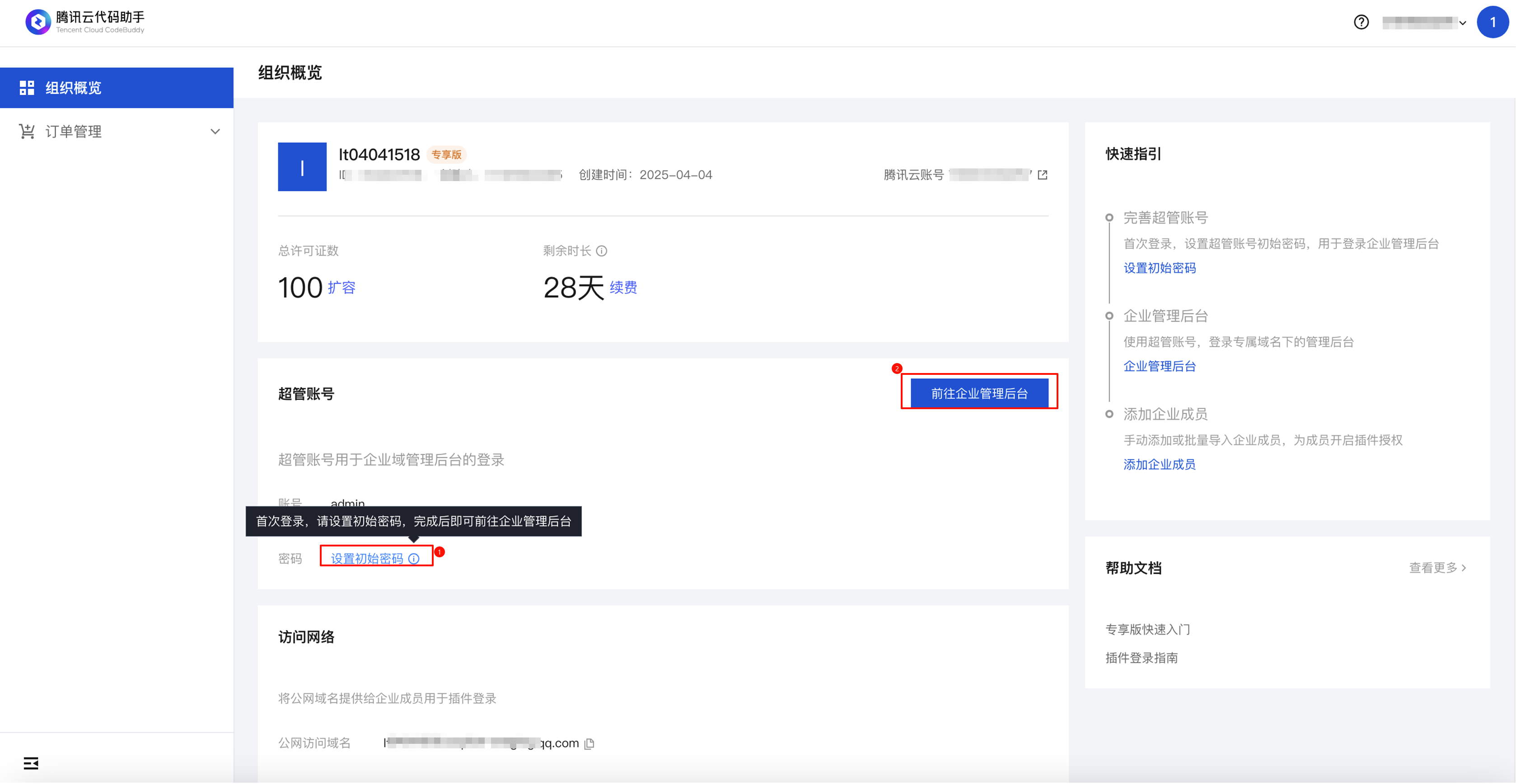 3. 首次登录需设置超管账号初始密码,设置完成后前往企业管理后台。
