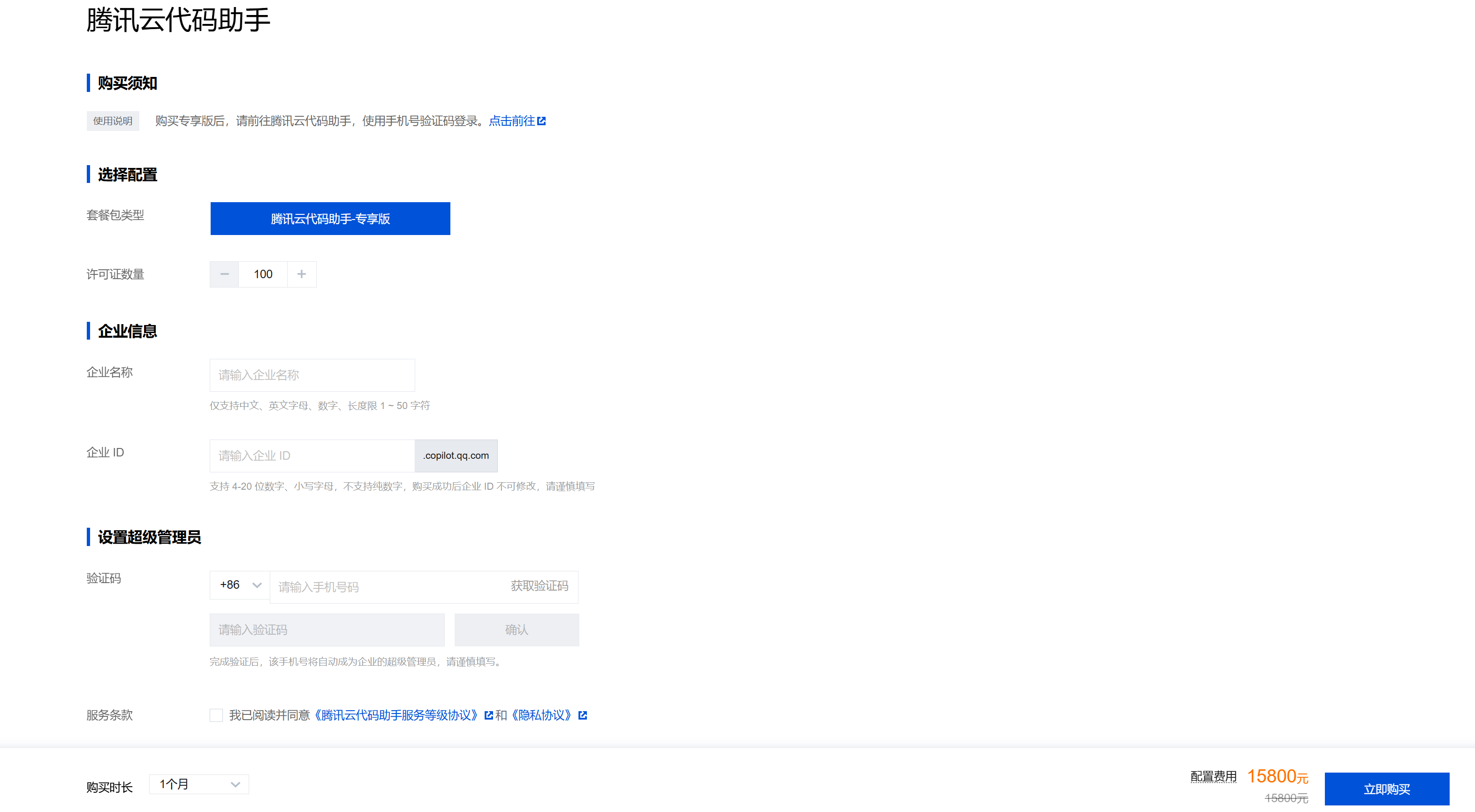 通过官网或企业后台,前往购买页,发起专享版企业新购,购买时输入企业名称、企业 ID、超级管理员手机号等信息。