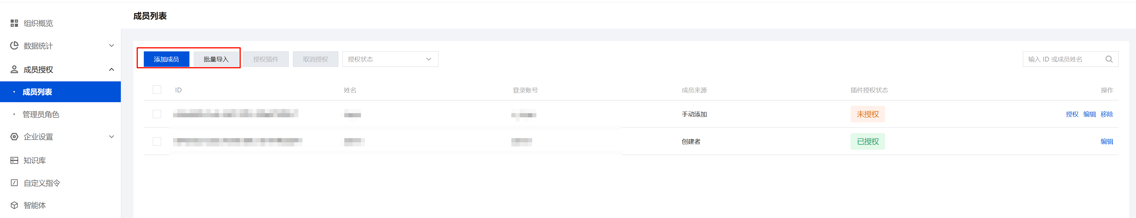 进入成员列表,通过手动添加或批量导入的方式,创建成员账号。