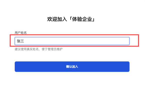 1. 企业成员打开受邀请链接或微信扫描二维码,输入用户姓名后,申请加入企业。