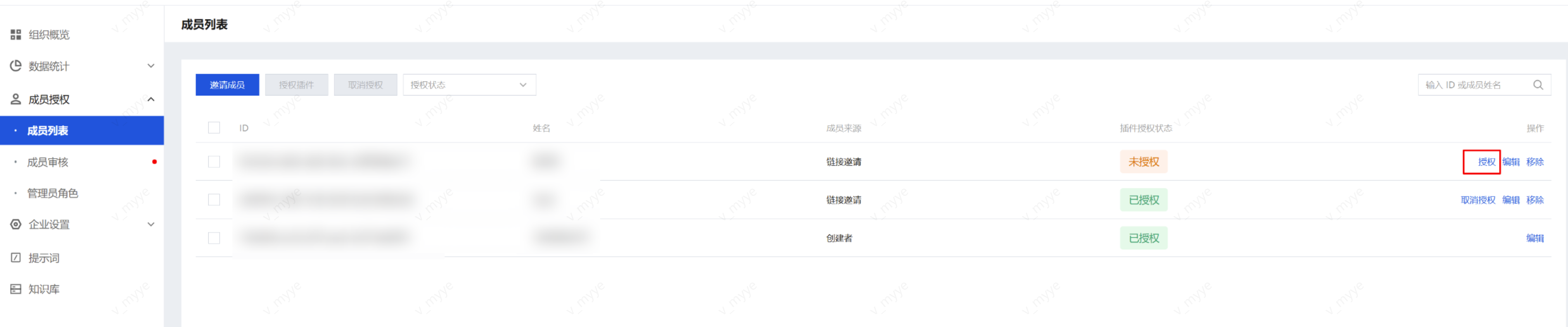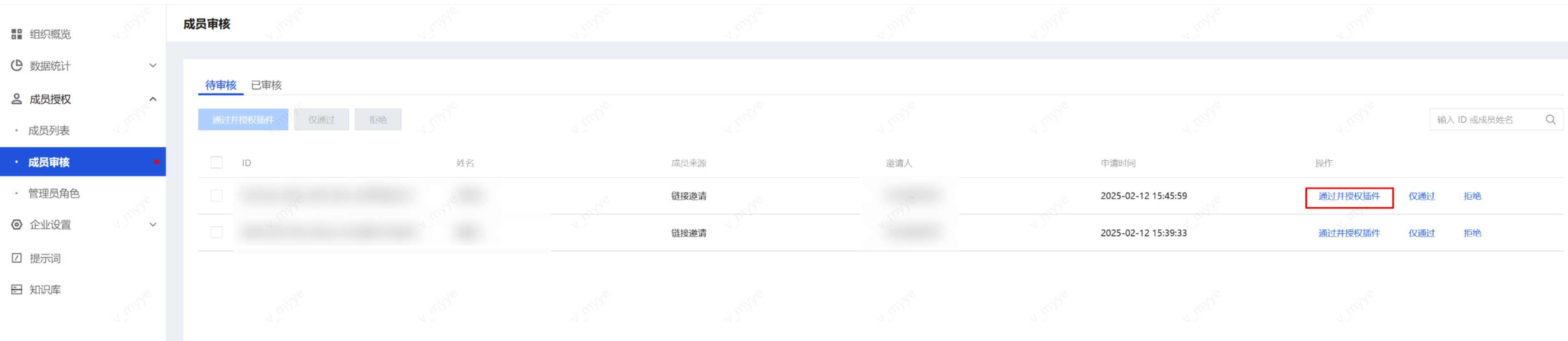 管理员进入成员审核页面,可以看到待审核的加入申请,单击通过并授权插件,即可将成员加入企业并开启插件授权。