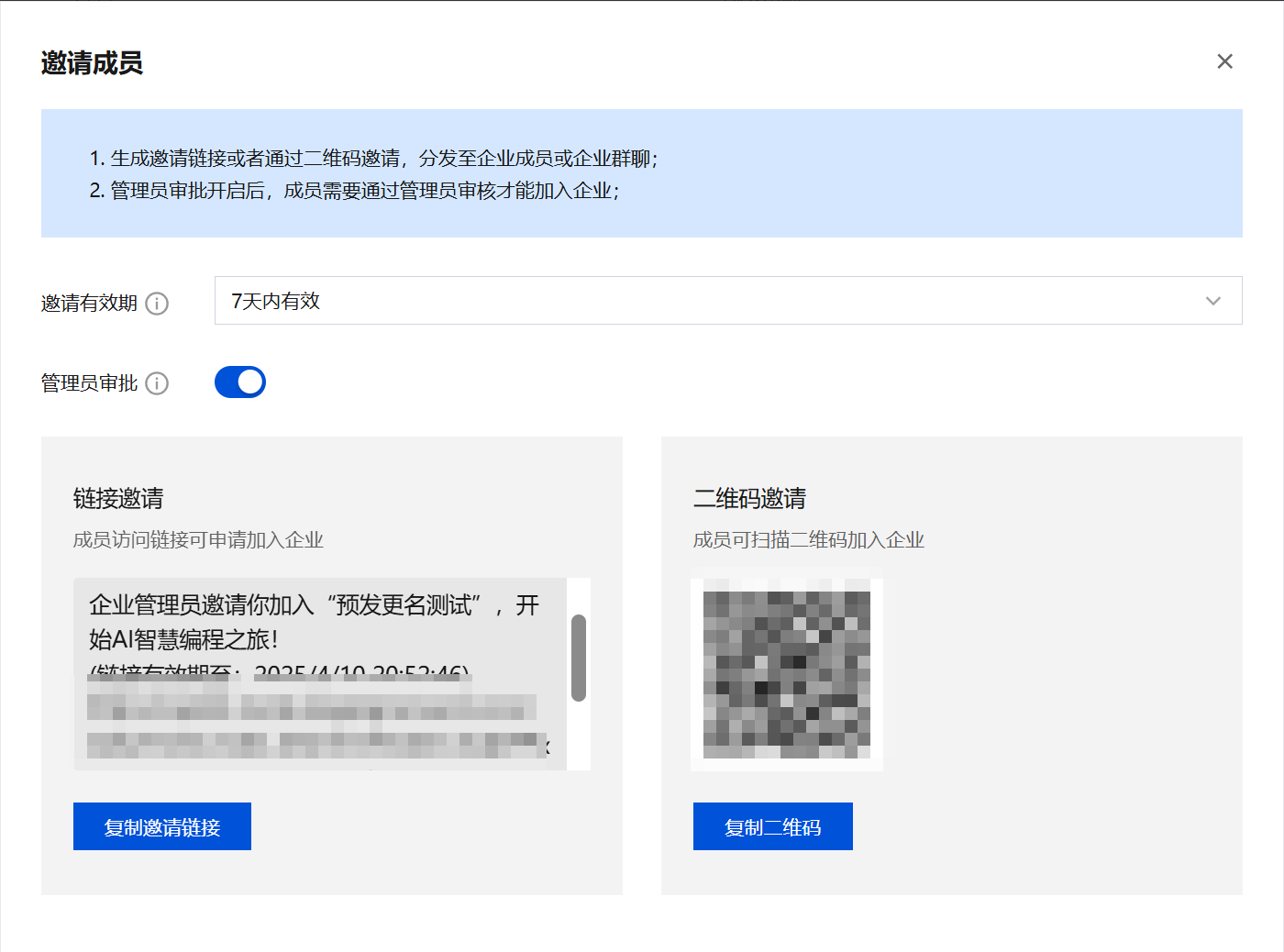 2. 在弹窗中可以选择链接或二维码邀请的方式,复制后发送给企业成员即可。