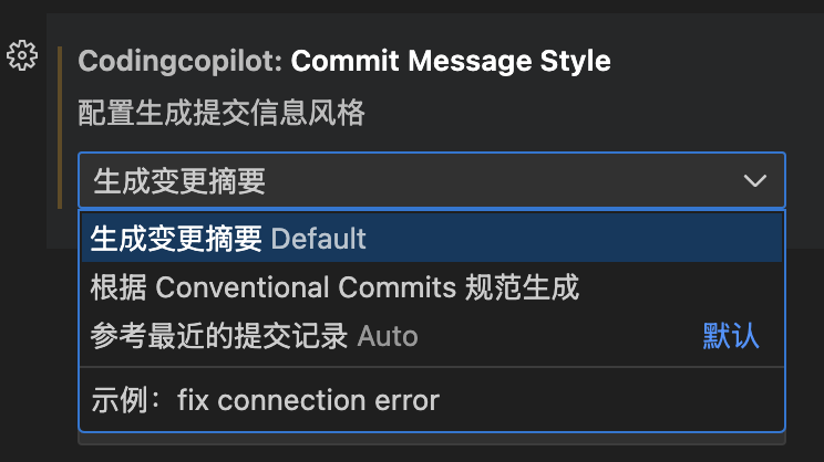 进入到插件设置里,在 Commit Message Style 中,选择配置 AI 提交信息生成的风格,如下图。