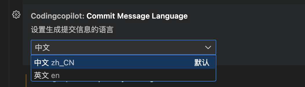 进入到插件设置里,在 Commit Message Language 中,配置 AI 提交信息语言,目前支持中文(默认)、英文。