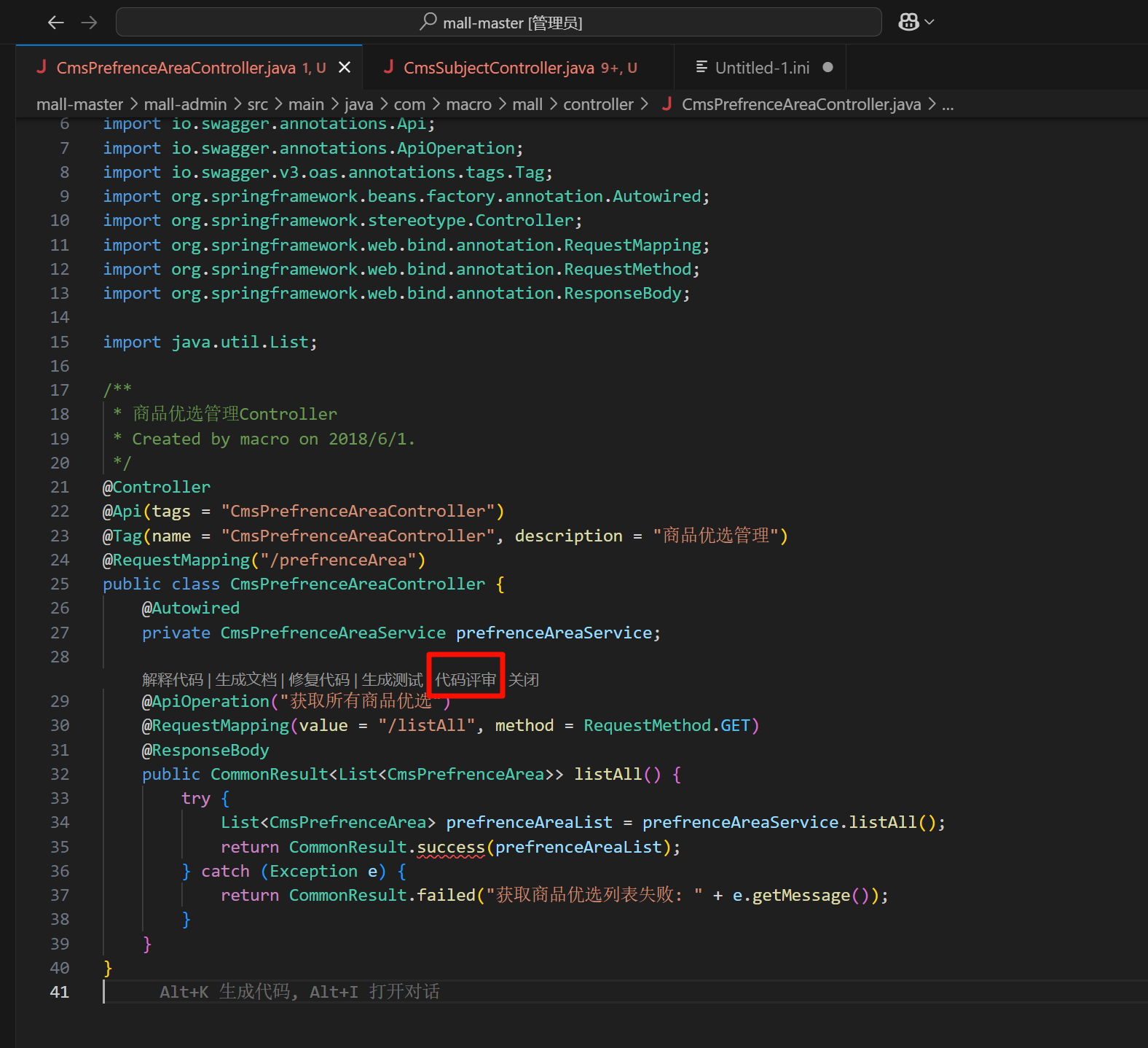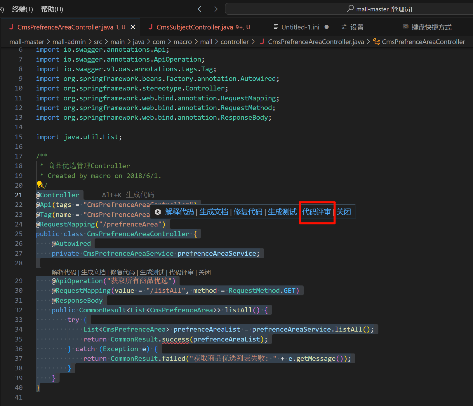 对于方法级评审,可以直接单击方法上方的代码评审来触发评审功能。