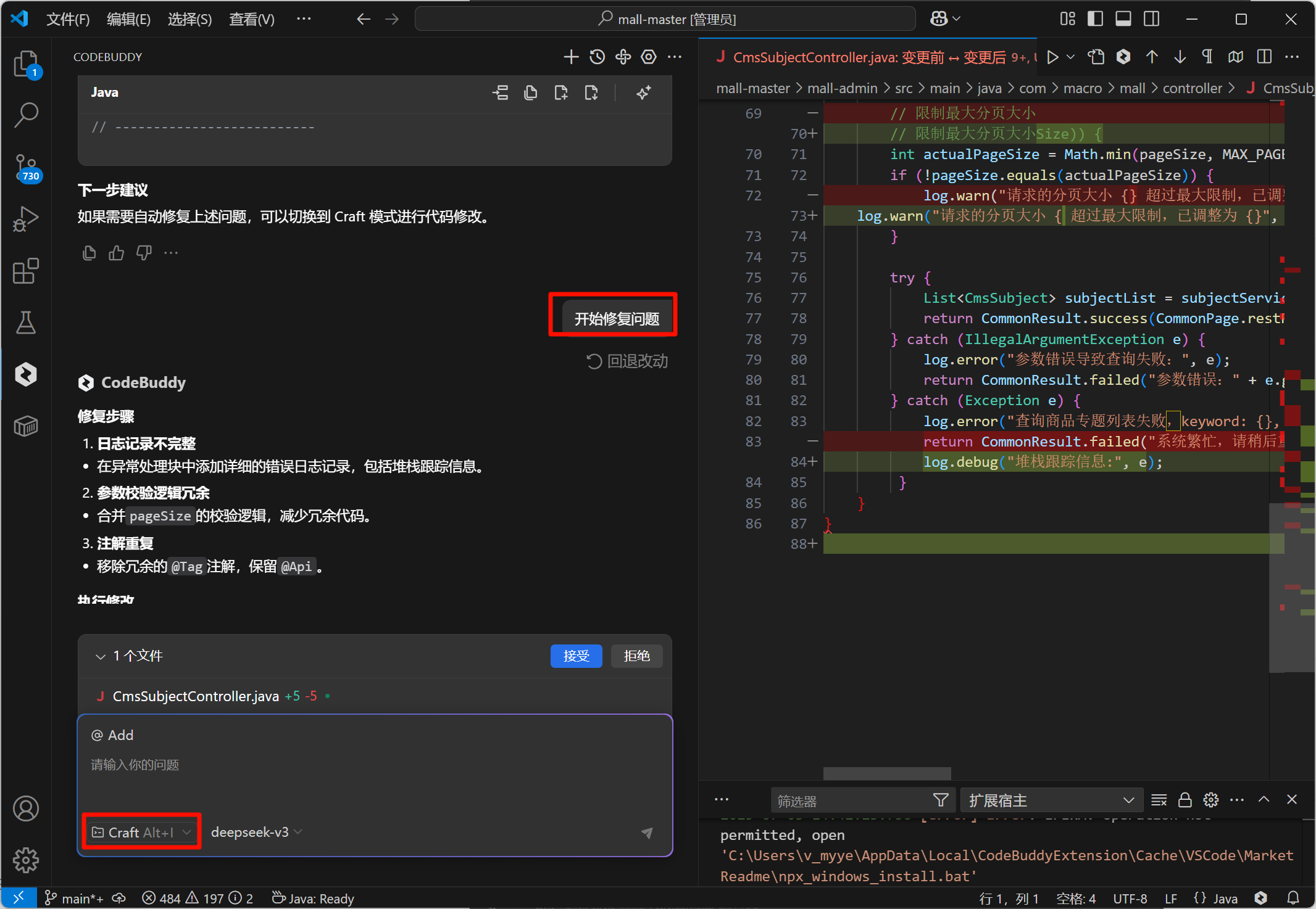 多个问题修复。您可以基于问题列表中的所有问题一次性进行修复。手动切换至 Craft 模式(可以单击对话输入框左下方模式切换按钮进行切换,也可以通过快捷键 Alt + I 进行切换),然后输入开始修复问题即可,Craft将自动帮您将问题列表中的问题进行修复。在修复的过程中,将以 Diff 的形式进行展示,最后修复完成后 ,检查如果没问题选择接受即可。