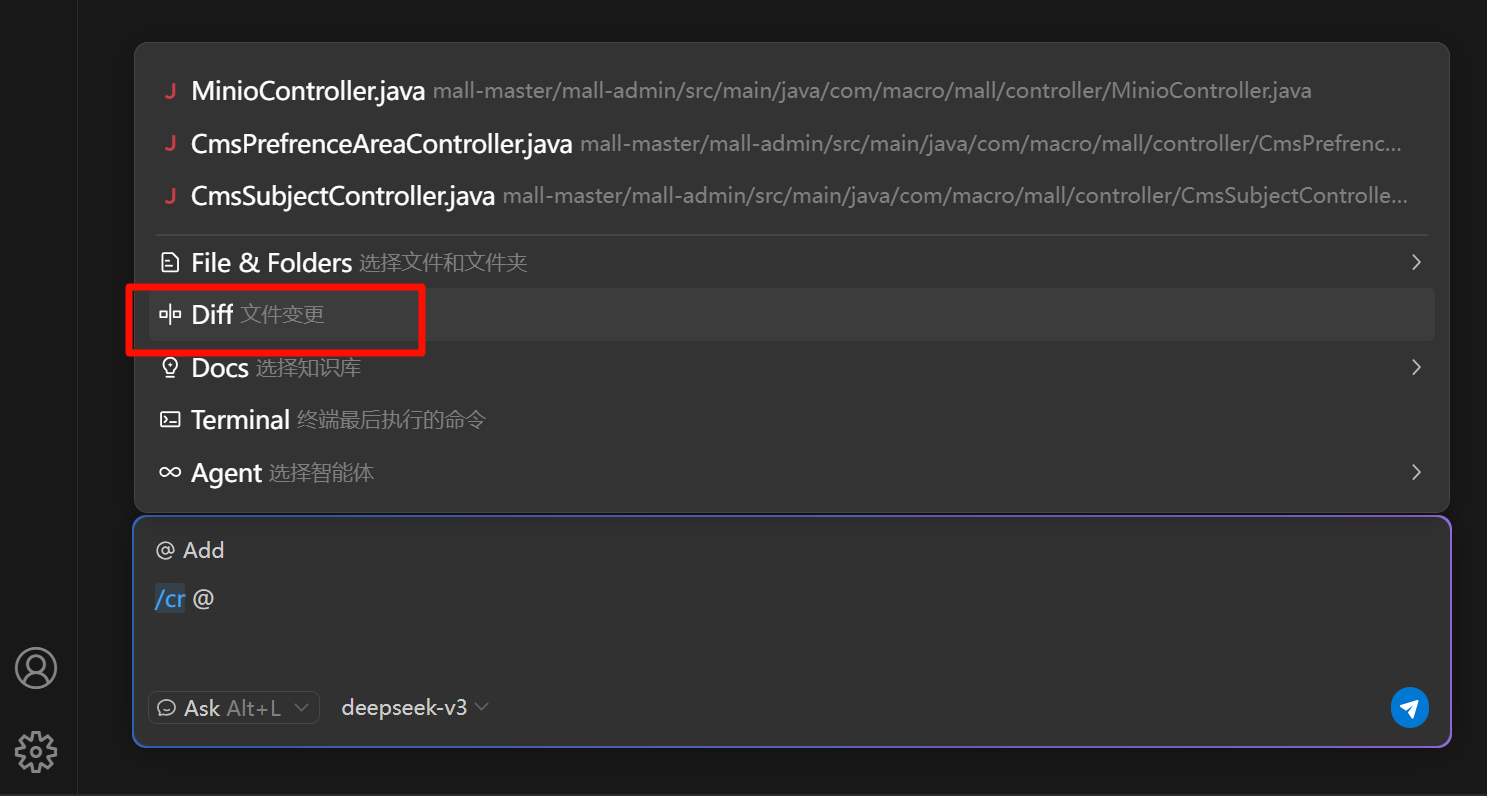 在对话输入框中输入 /cr,然后选择 Diff,将评审 IDE 内暂存区的所有文件。本指令将评审暂存区文件的变更部分,非变更部分将不评审。