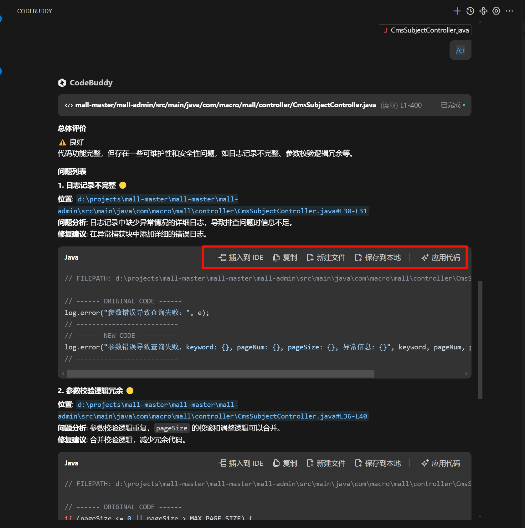 代码评审结束后,在对话面板内将直接返回评审结果,评审结果中将包含总体评价和问题列表,在问题列表中支持显示并单击蓝色位置区域跳转至问题所在文件代码片段进行查看。