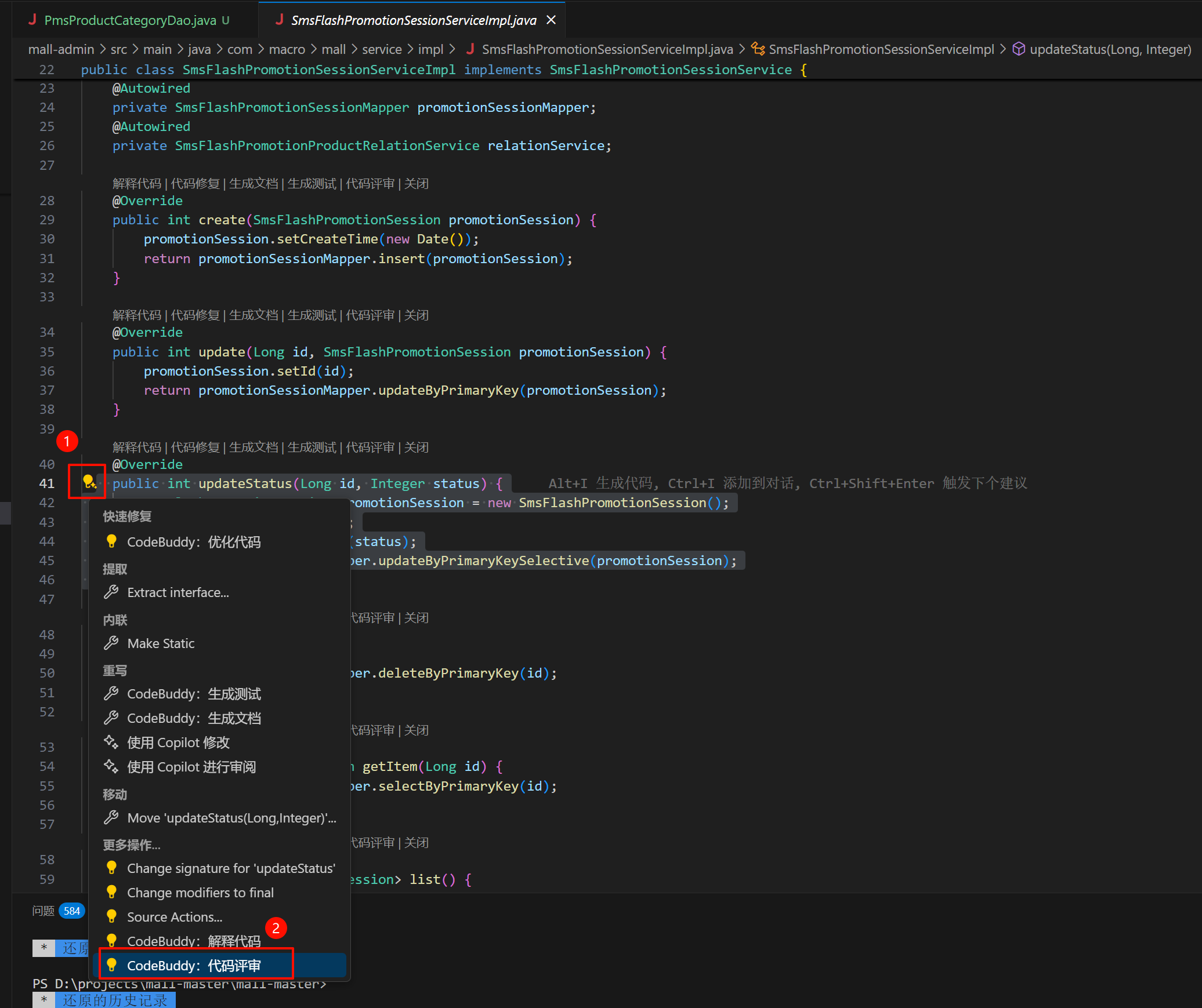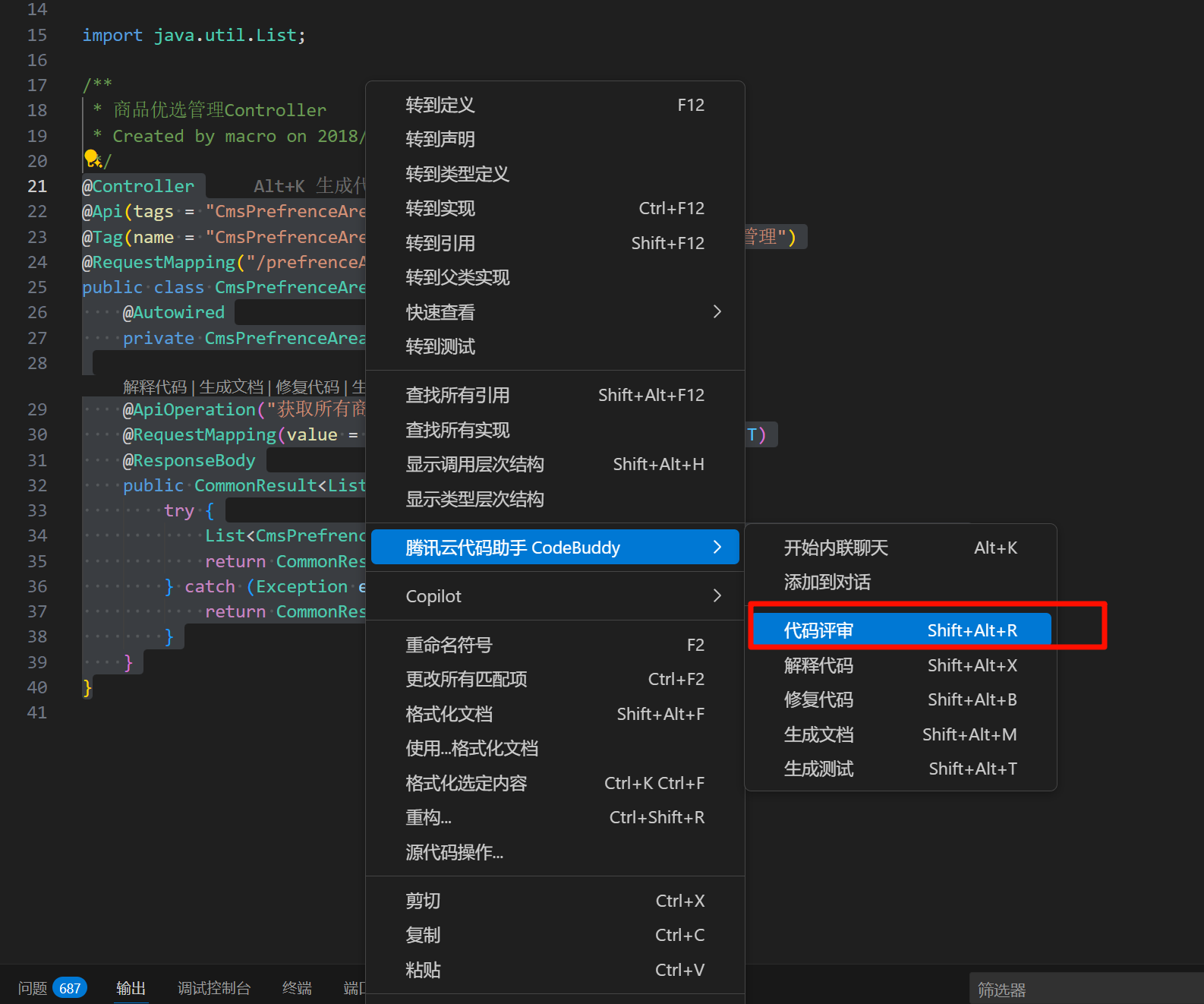 圈选代码区域后,也可以右键选择 腾讯云代码助手 CodeBuddy > 代码评审来触发评审功能。