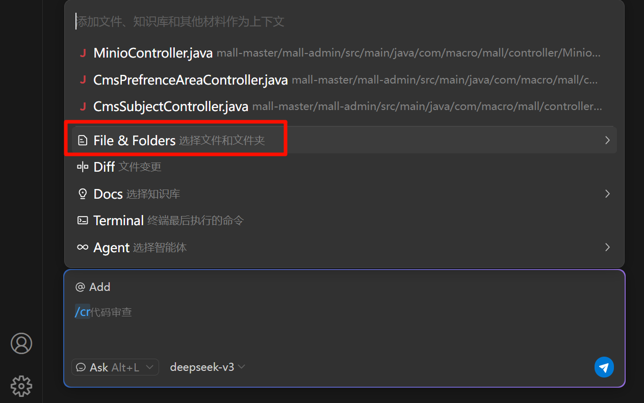 您可以根据自己的需求,选择评审范围。例如:选择评审文件或文件夹进行评审时,通过 /cr 指令选择评审文件或文件夹后回车,将直接触发对所选文件或文件夹的评审。